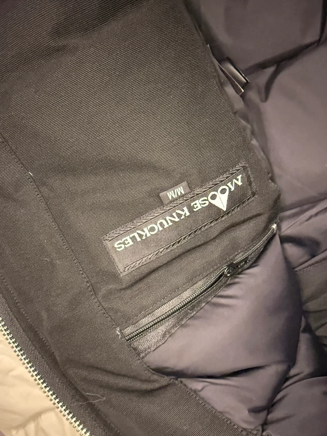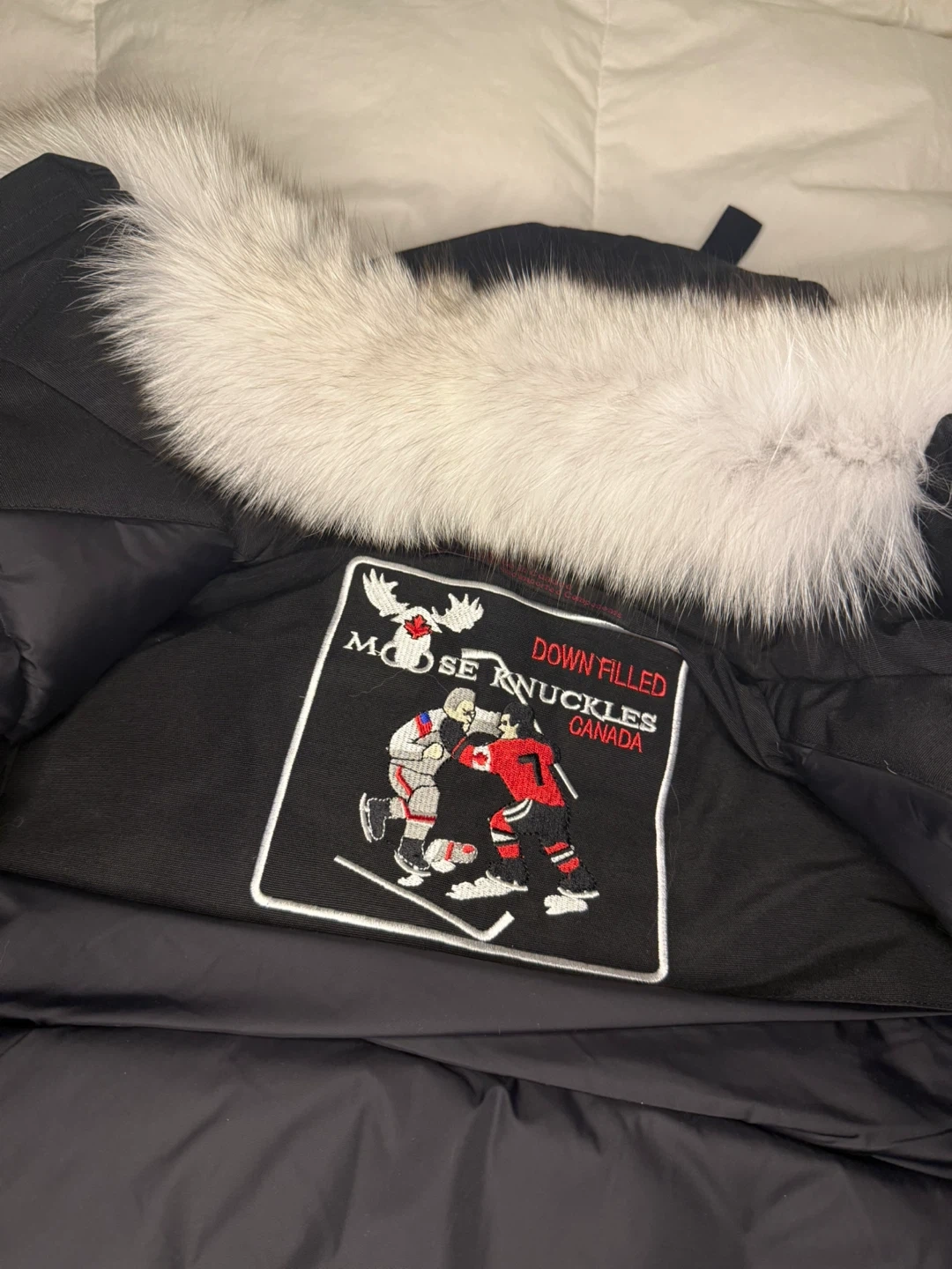 Selling a Moose Knuckles bomber jacket in size M/M. It's black with a white fur trim on the hood and pom poms. The jacket features the iconic Moose Knuckles logo on the sleeve and a hockey player design on the back.