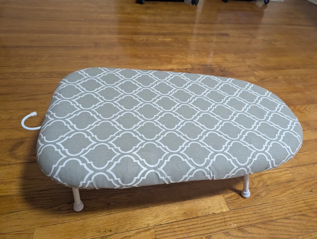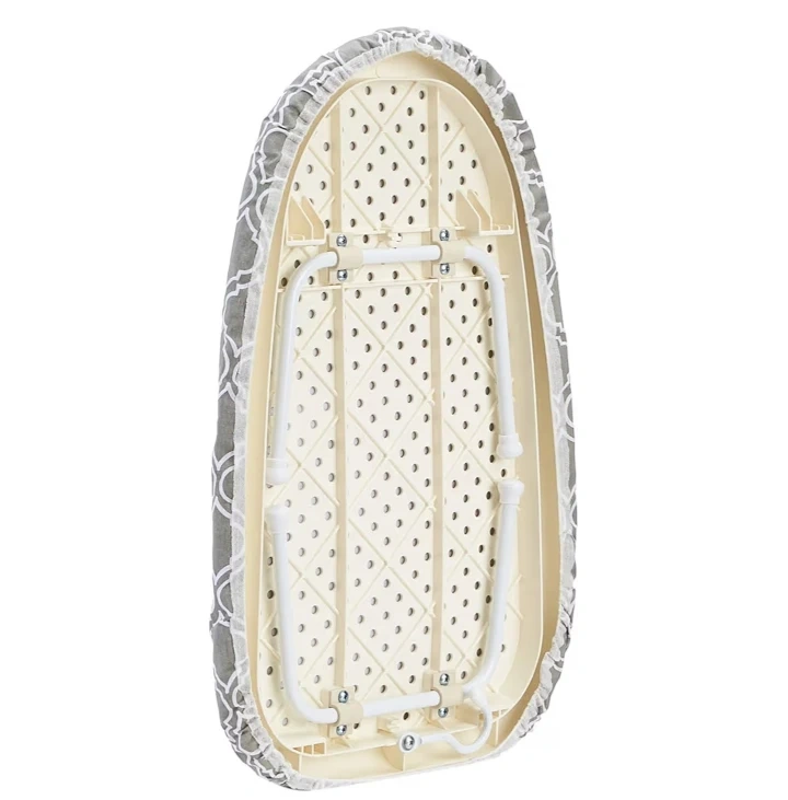 Compact ironing board. The ironing board is grey with a white pattern and has dimensions of approximately 59.94cm x 36.32cm x 18.03cm. Perfect for small spaces and quick ironing jobs!