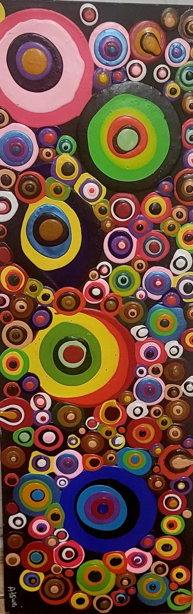 This is a unique and vibrant painting featuring an array of colorful circles on a dark background. It's sure to add a pop of fun to any room! The painting has a textured feel due to the raised circles.