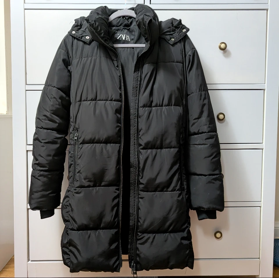 Selling a gently used Zara black puffer coat! It comes with a detachable faux fur. Perfect for those chilly Canadian winters. The size is XS. 2 large front pockets, one inner pocket.