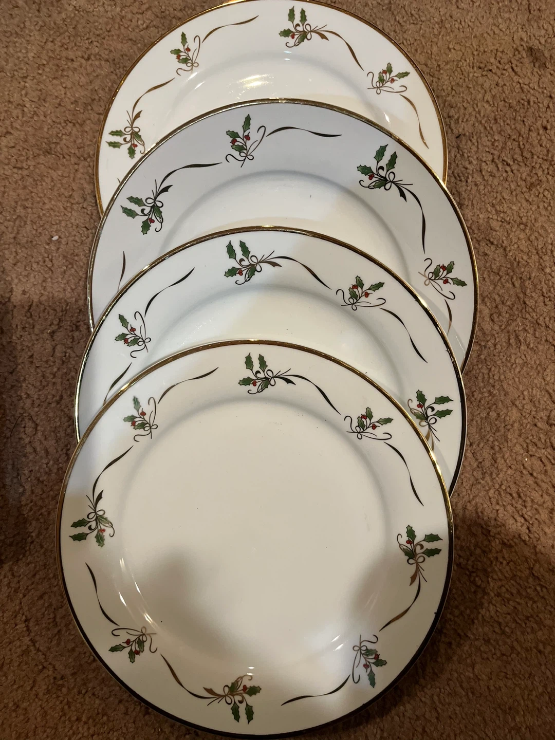 Selling a set of 4 accent plates, perfect for the holidays! They're white with a festive holly design and a gold trim. Great for adding a touch of seasonal cheer to your table setting