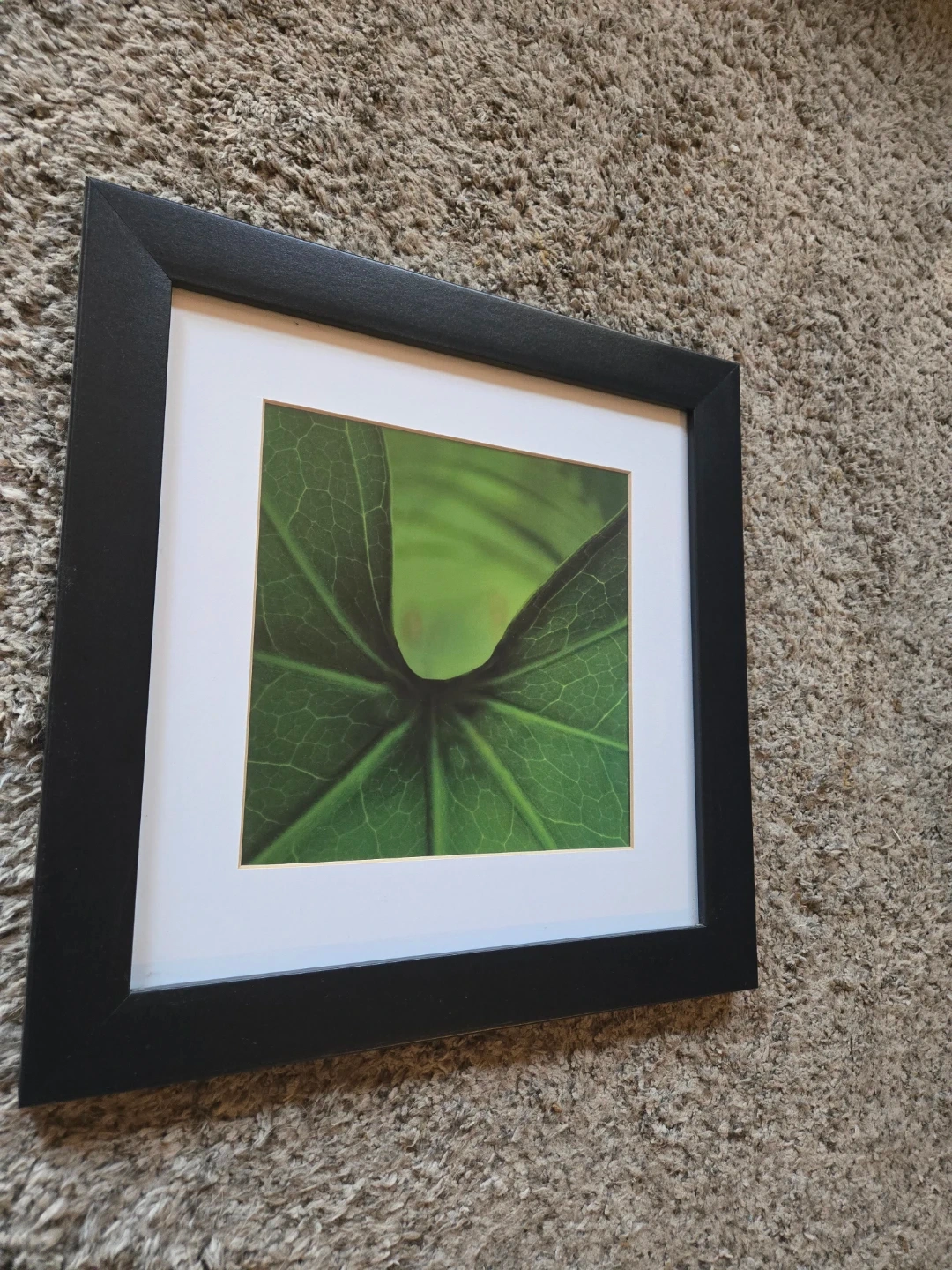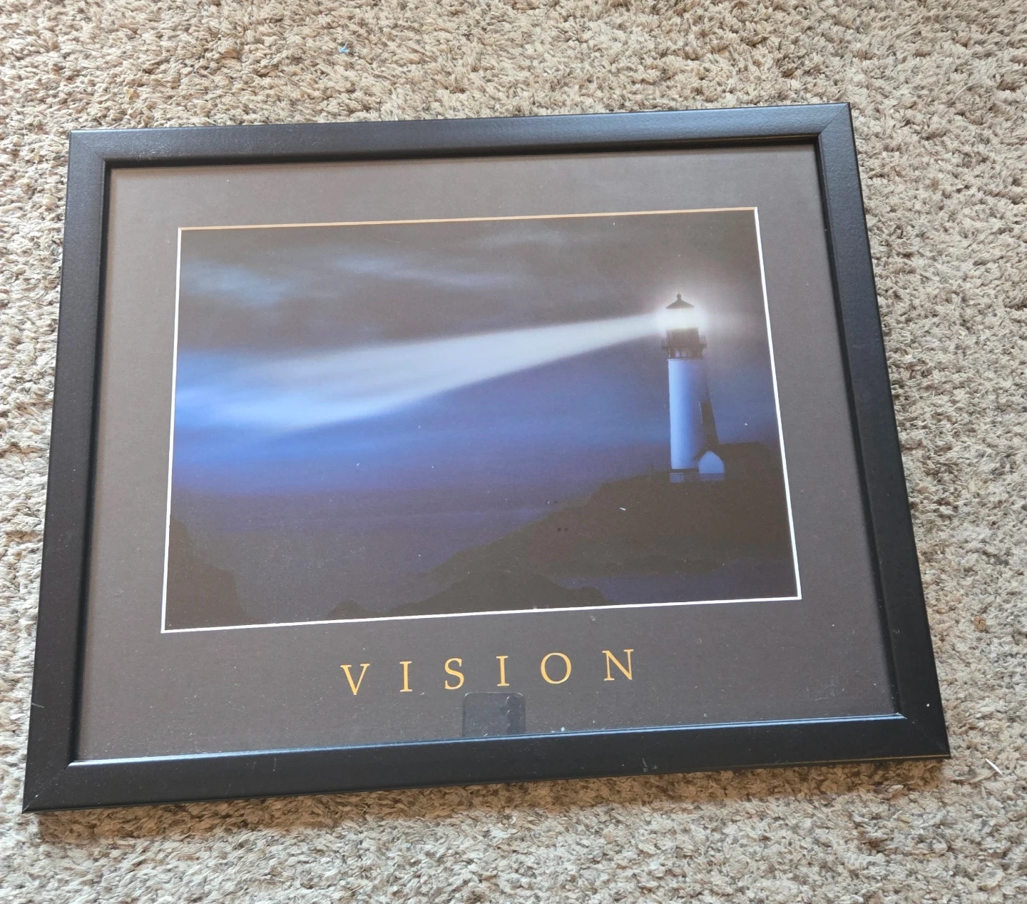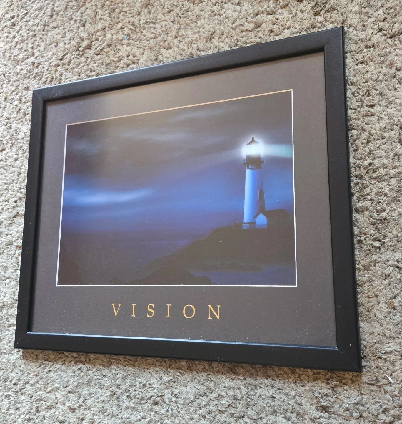 Selling two framed prints. One is a close-up of a frog on a leaf, and the other is a lighthouse scene with the word 'VISION' printed below. Both have a black frame and would look great in any room!
