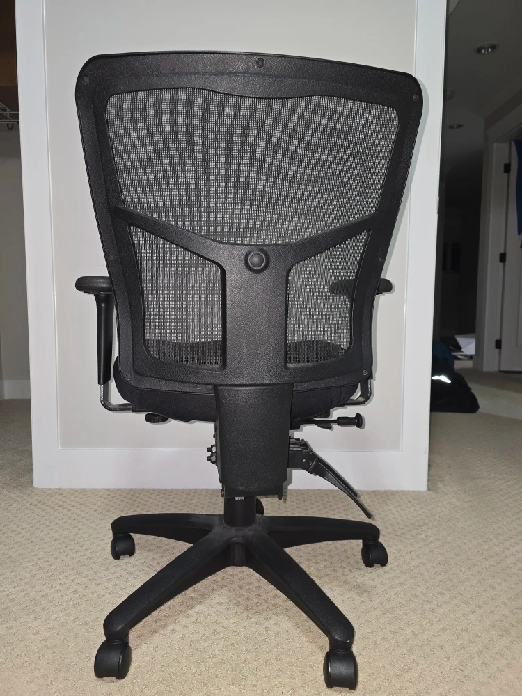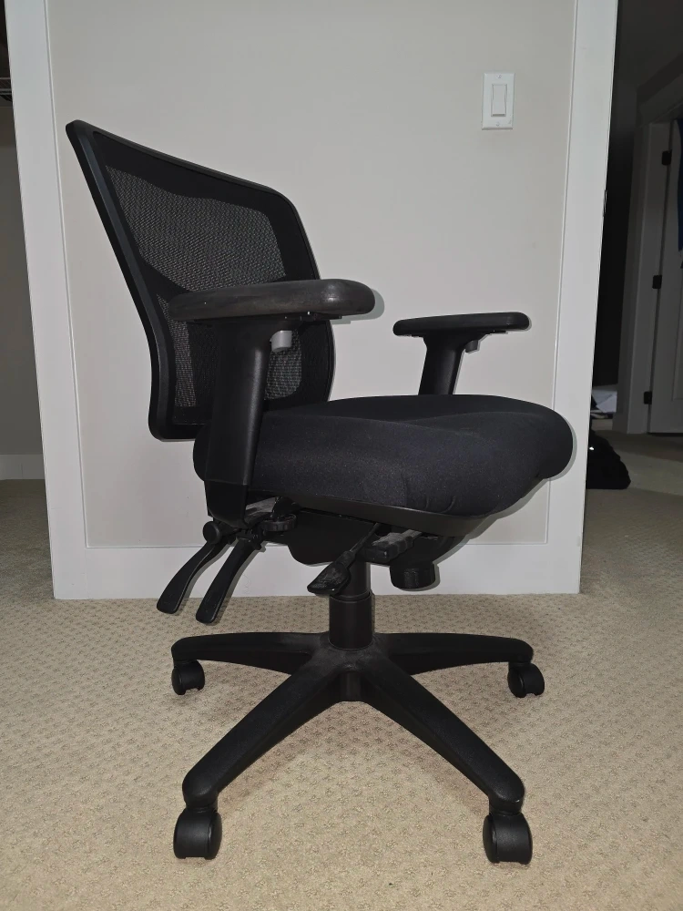 Selling a black office chair. It's in good condition and ready for a new workspace! It features a mesh back and adjustable armrests.