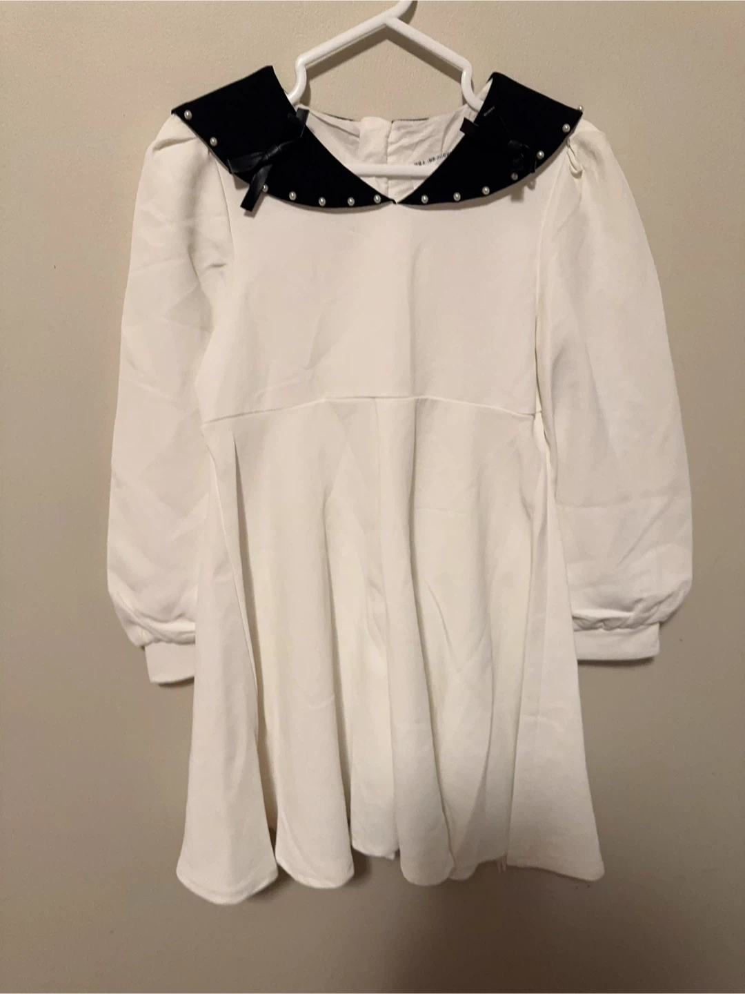 Cute white dress with a black collar and pearl accents! It's in great condition and would be perfect for a special occasion or just a fun day out. The dress has long sleeves and a pleated skirt, giving it a classic and stylish look