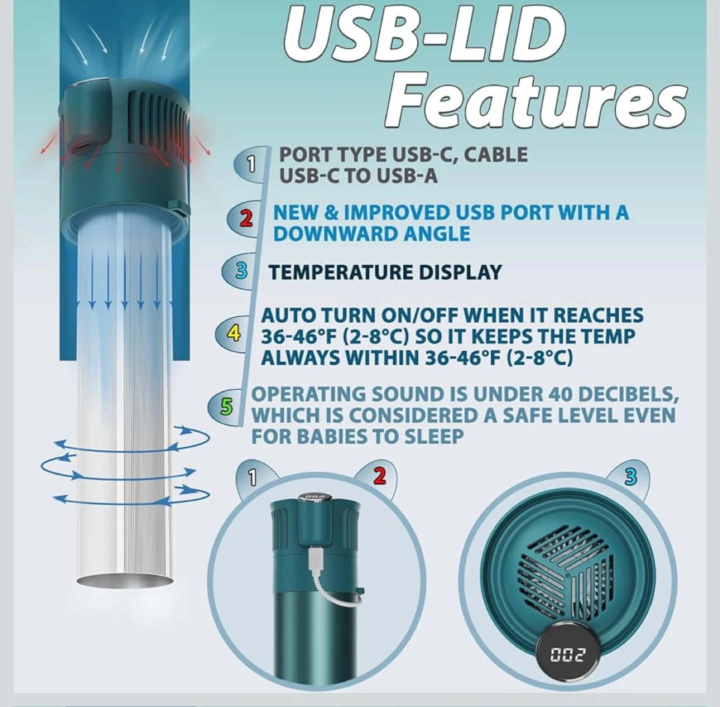 It's airport security control approved and includes an extra empty emergency bottle. The cooler's dimensions are approximately 10.8" in height and 2.6" in diameter. It's made with food-grade 304 stainless steel and has 5 layers of insulation to ensure optimal protection