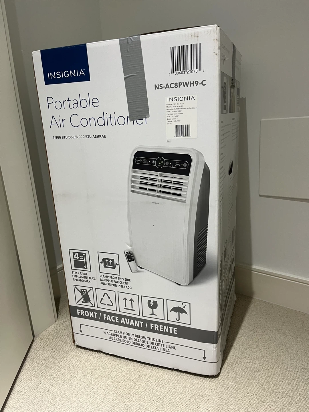 Selling an Insignia portable air conditioner, model NS-AC8PWH9-C. It's a 3-in-1 design that works as an air conditioner, dehumidifier, and fan. It has caster wheels for easy moving around. The included remote control makes it easy to adjust the settings. Comes with the exhaust hose and adapter, remote control, sealing gaskets, assembly hardware, and quick setup guide. Dimensions are 26.9 H x 14.7 W x 13.5 D inches (68.4 x 37.3 x 34.2 cm) and it weighs 44.1 lbs (20 kg).