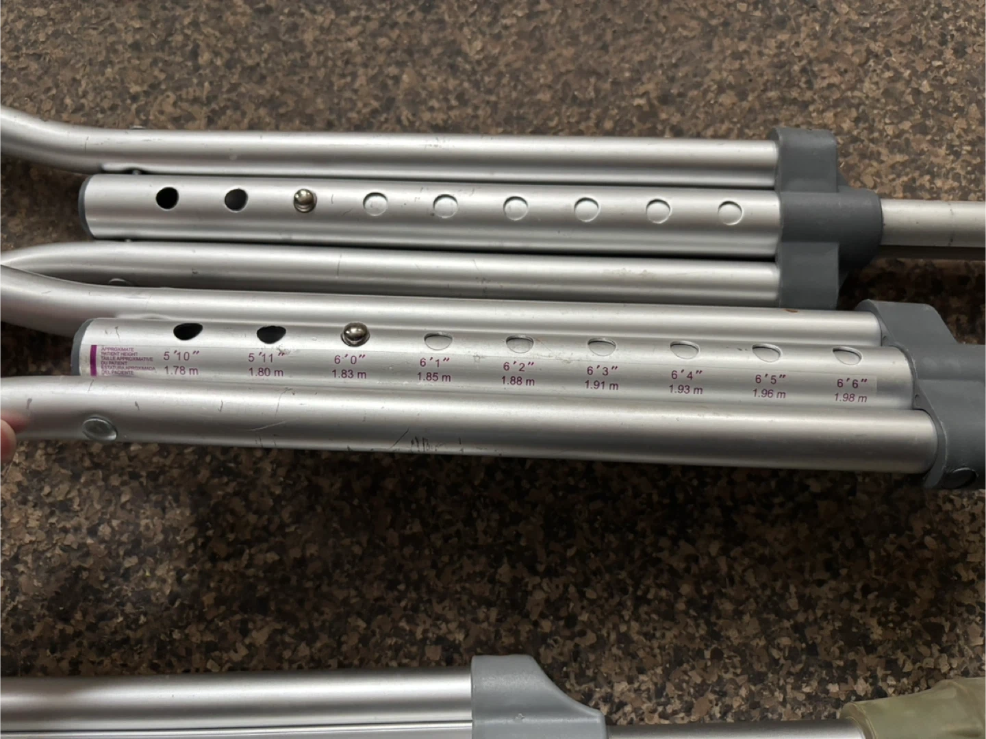 Selling 2 pairs of adjustable aluminum crutches. One set of crutches are adjustable for heights from 5'2" to 5’10". One set of crutches are adjustable for heights 5’10” to 6’6”. They're in good condition and ready to use! $15 each.