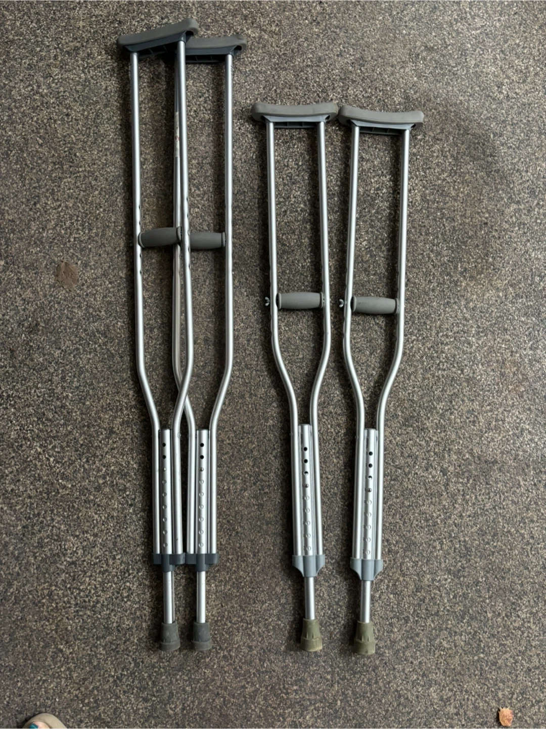 Selling 2 pairs of adjustable aluminum crutches. One set of crutches are adjustable for heights from 5'2" to 5’10". One set of crutches are adjustable for heights 5’10” to 6’6”. They're in good condition and ready to use! $15 each.