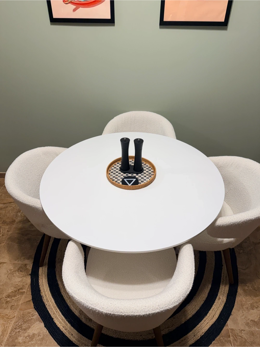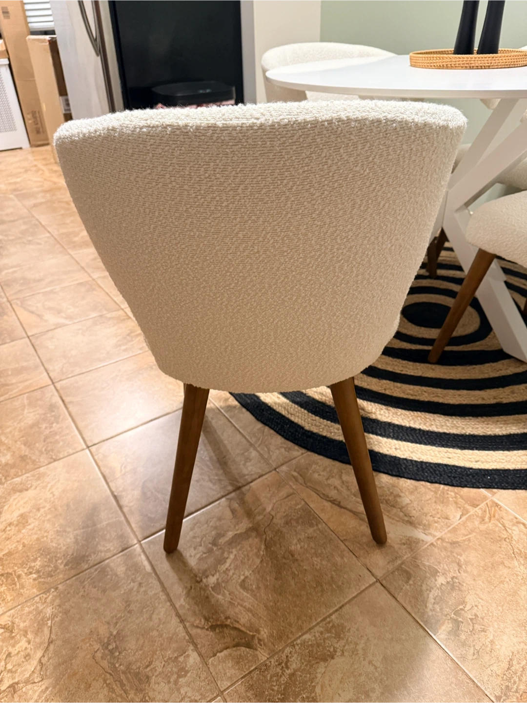 Selling a set of 4 ivory boucle dining chairs & Table. They're in great condition and would look lovely in any dining room or kitchen. The soft boucle texture adds a touch of elegance and comfort to your dining experience!