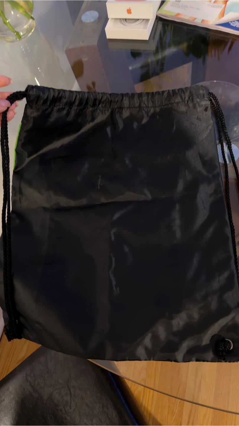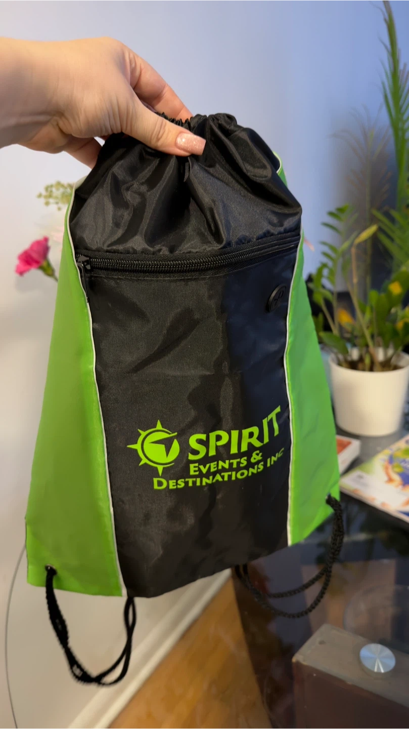 Selling a drawstring bag from Spirit Events & Destinations Inc. It's black with green accents and has a zipper pocket on the front. Perfect for carrying your essentials!