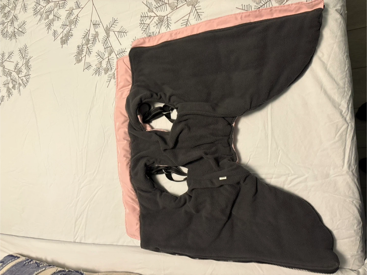 Selling a dog coat in pink and grey. It's in great condition and ready to keep your furry friend warm during the colder months! It has a zipper and harness straps.size medium. Up to 60 lbs