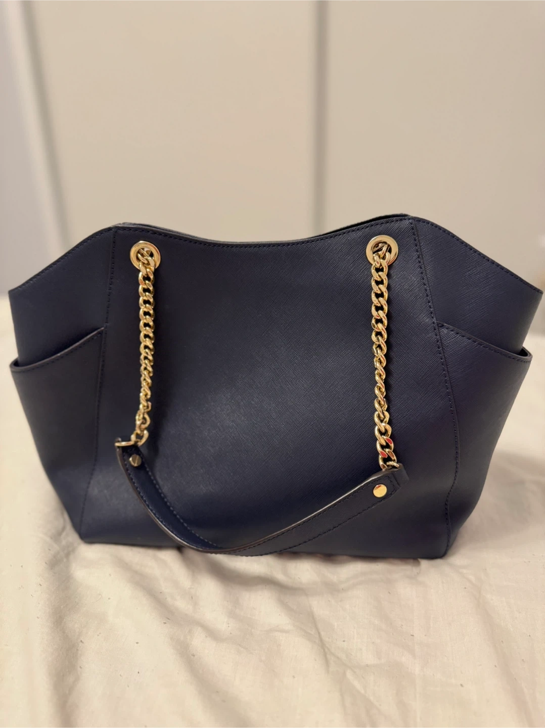Selling a Michael Kors tote bag in navy blue. It features gold chain detailing and the MK logo. It's in great condition and perfect for everyday use!