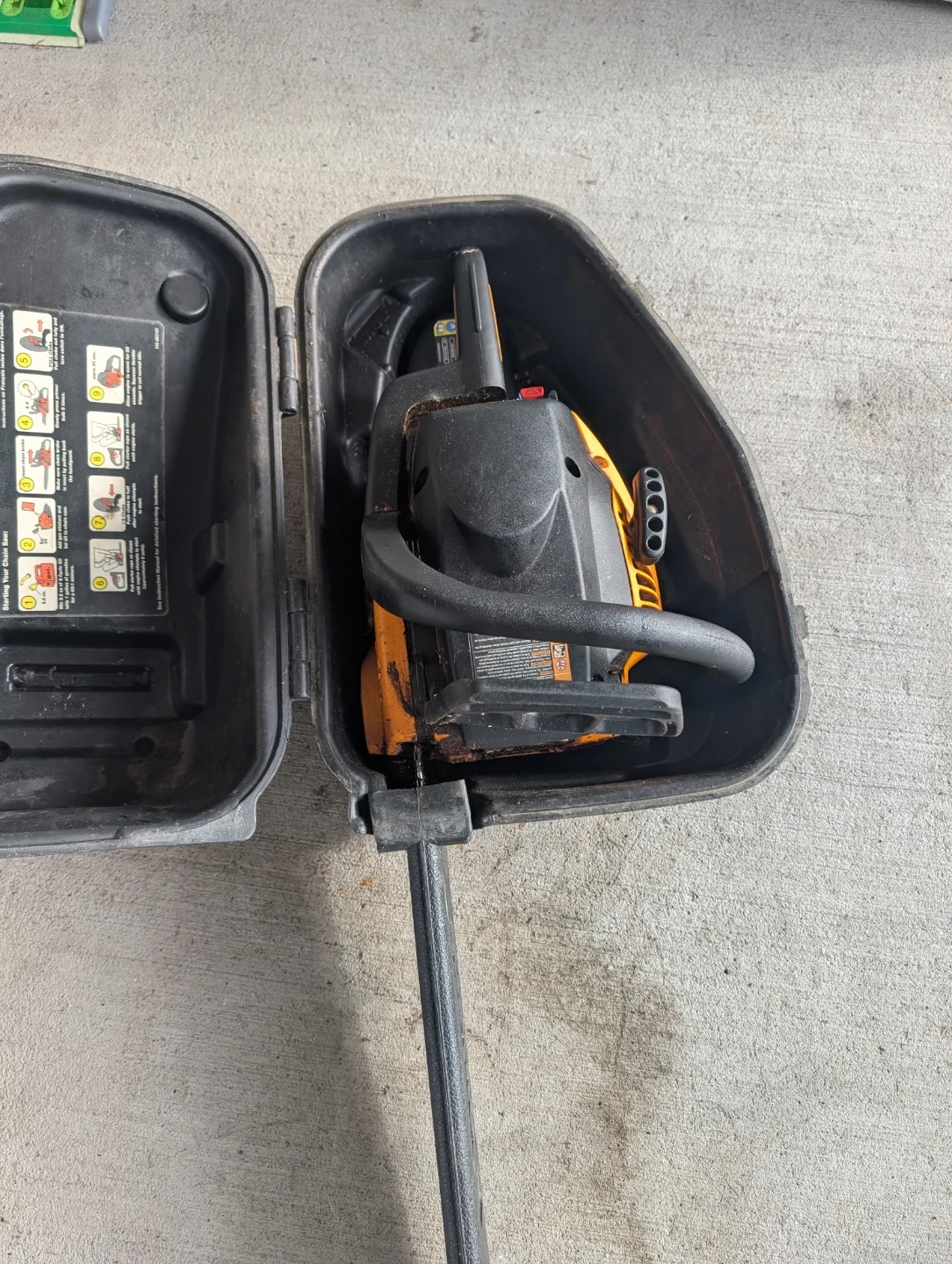 Selling a Craftsman chainsaw, complete with its carrying case. It shows some signs of use but is still functional. Please refer to the photos for a closer look at the condition.
