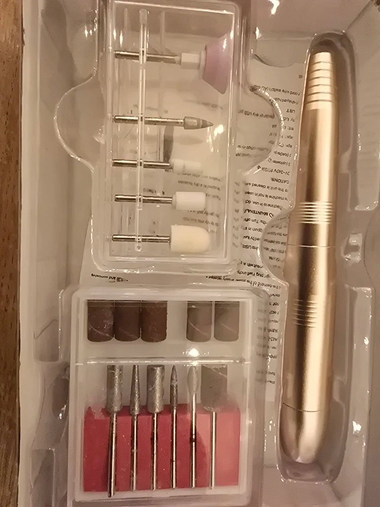 Selling a gold electric nail drill kit. It comes with all the components and accessories shown in the photos. The box is included too!