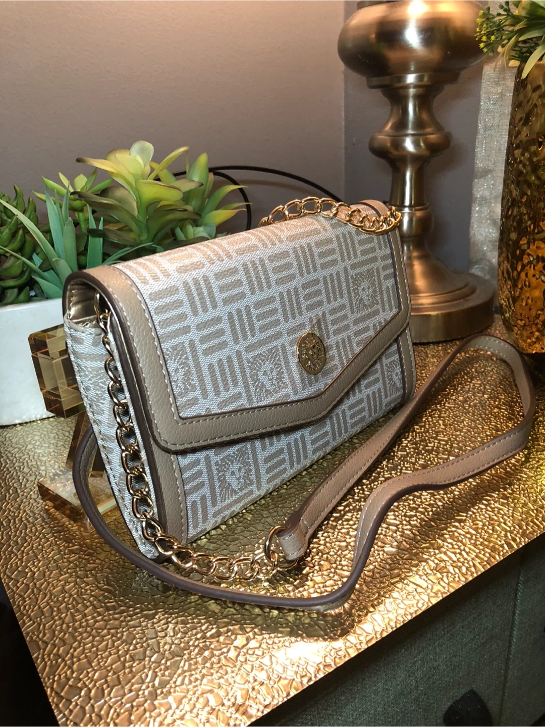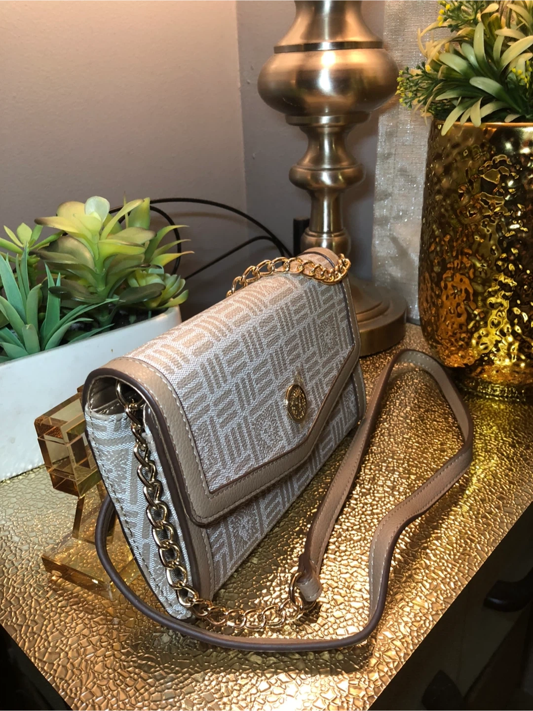 This is an Anne Klein crossbody bag. It has a beige and white pattern with a gold chain strap. It's in great condition and ready for a new owner!