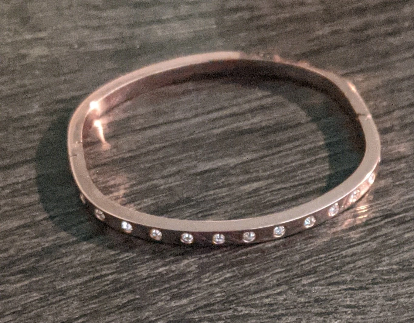 Selling a beautiful rose gold bangle bracelet. It features a row of sparkling stones that catch the light nicely. It's in great condition and would make a lovely addition to any jewelry collection!