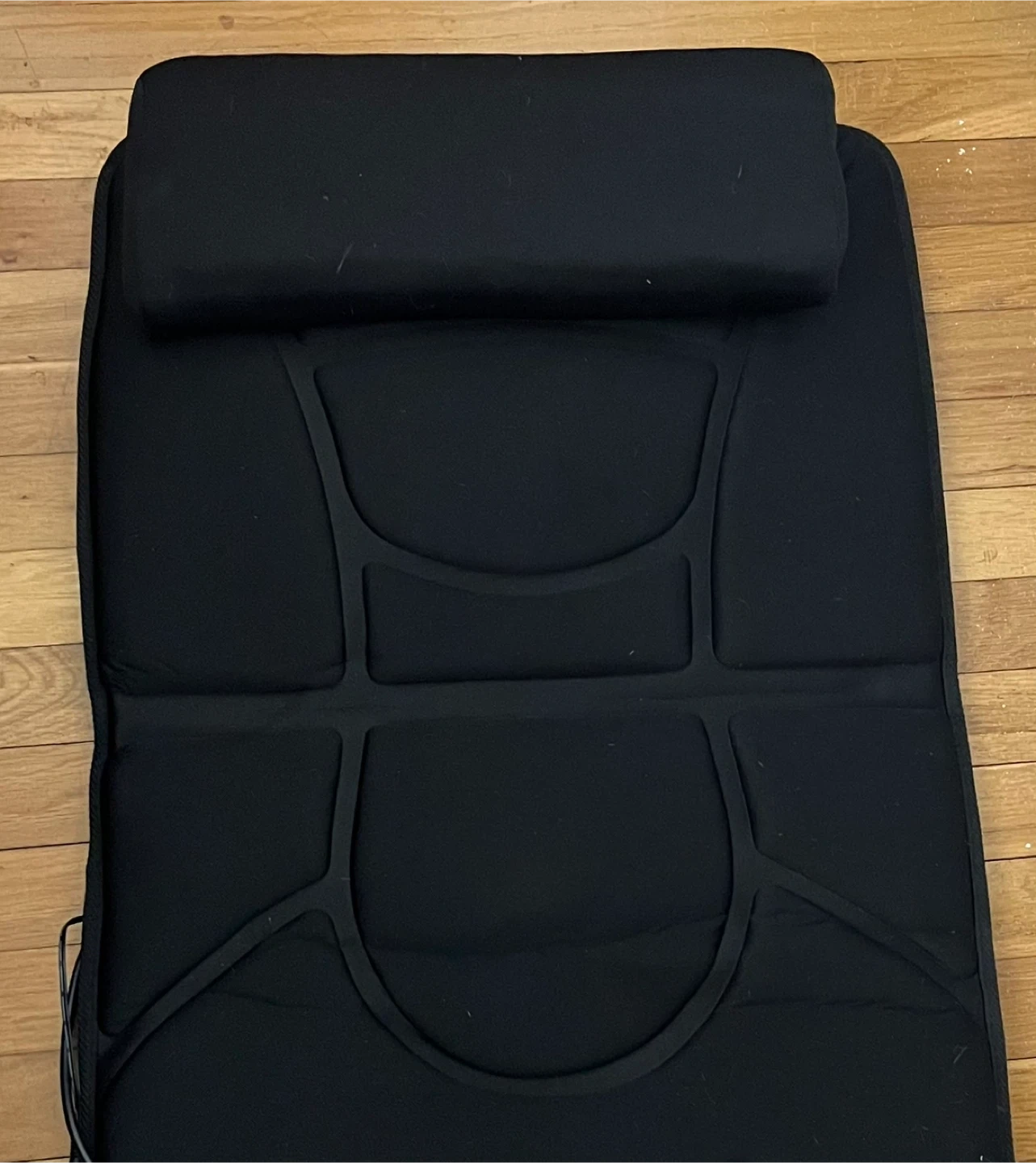 I'm selling a full-size body massage mat with soothing heat! It features five massagers, a removable pillow, and soothing heat. The box includes a massage controller with multiple speeds. Enjoy a relaxing full body massage on your bed, sofa, lounge, or carpeted floor