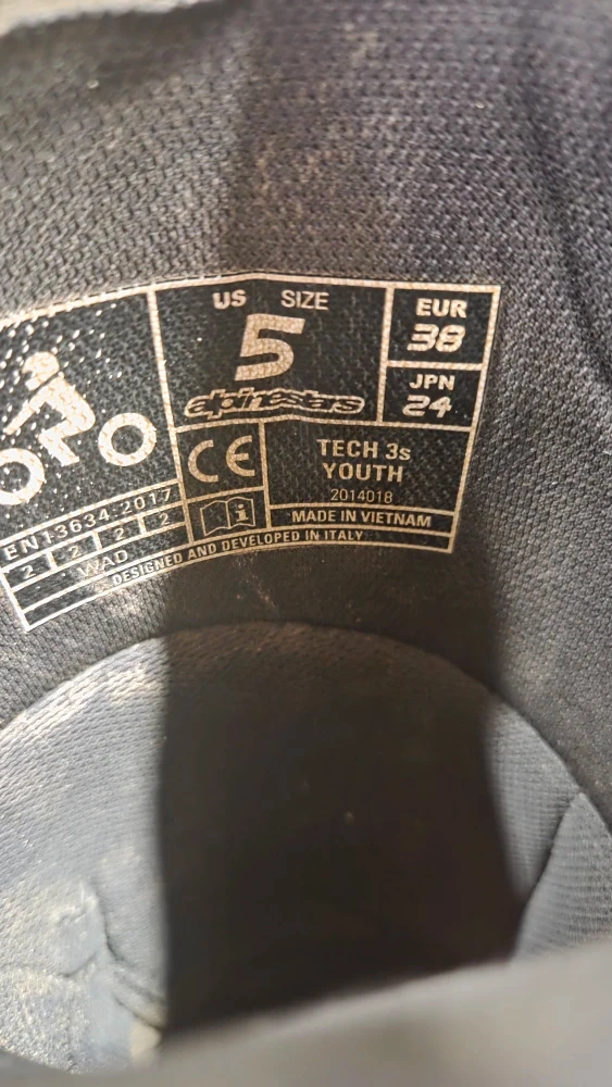 Selling a pair of Alpinestars Tech 3s Youth motocross boots. They are a US size 5, EUR 38, and JPN 24. These boots are designed and developed in Italy and made in Vietnam. They show signs of use but still have lots of life left!