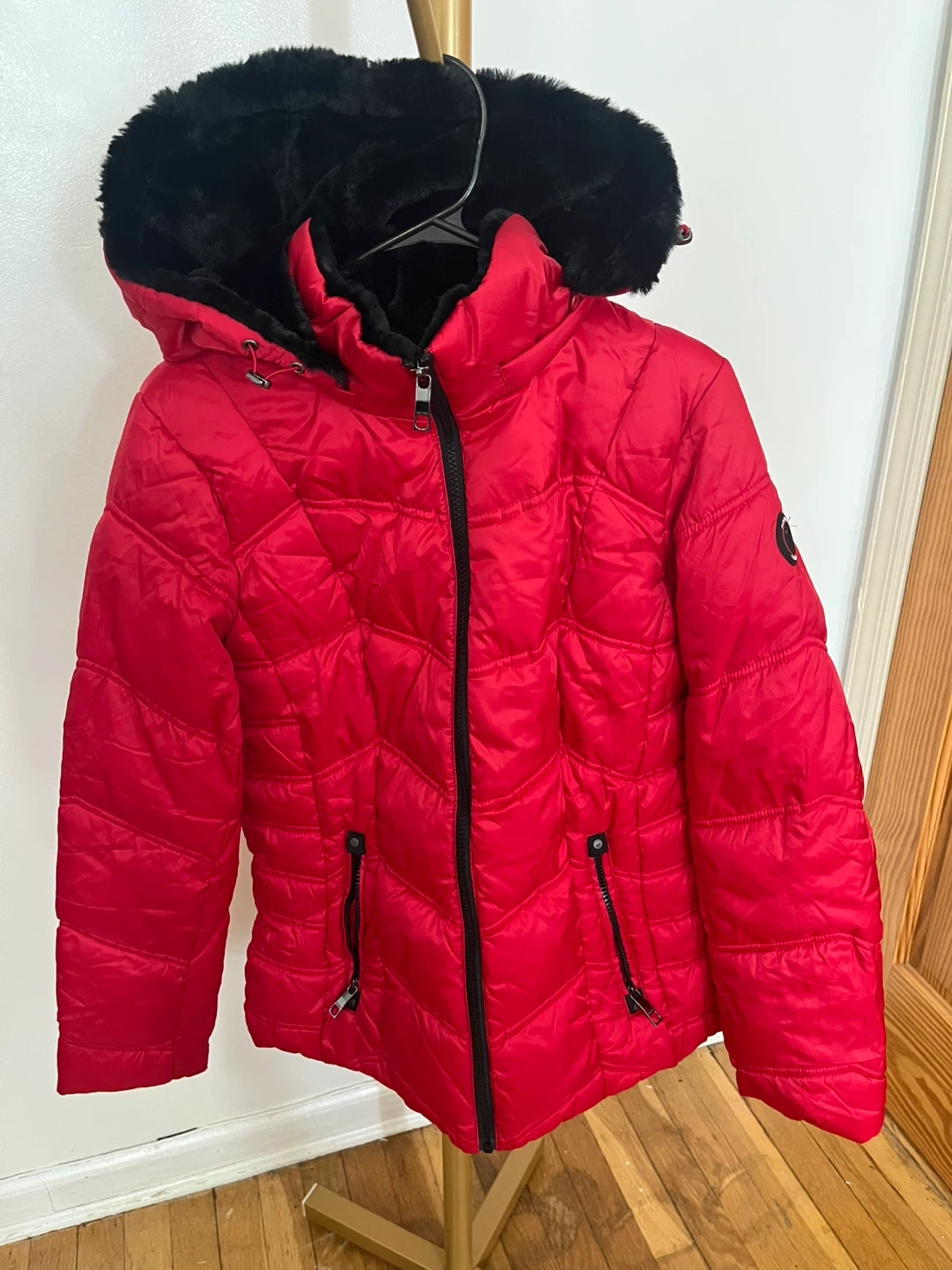 Selling a red Nautica puffer jacket in size M. It's water-resistant and has a detachable hood! Perfect for staying warm and dry.