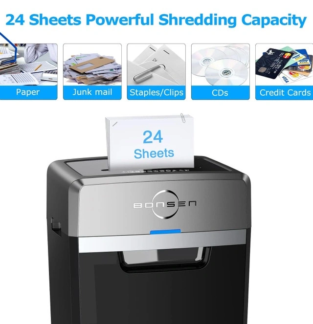 This Bonsen commercial paper shredder is like new, ready to handle all your shredding needs with ease! It can shred up to 24 sheets at once, and even takes care of staples, clips, CDs, and credit cards. Its superior P-4 security level ensures your confidential information stays protected. It's so efficient, it practically does the shredding before you even think about it!