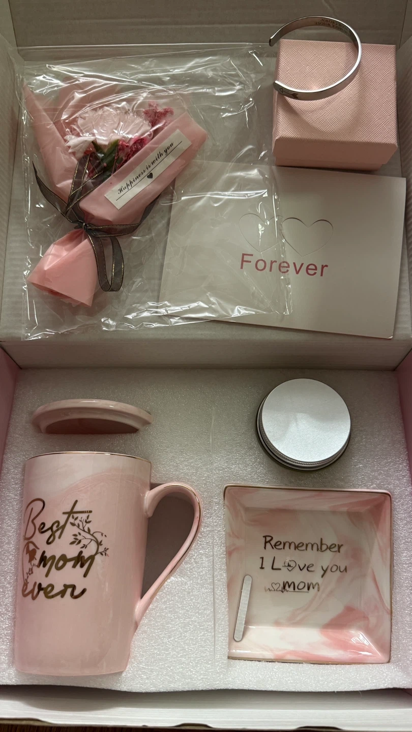 A beautiful pink Mother's Day gift set, perfect for showing your appreciation! The set includes a mug with 'Best Mom Ever' written on it, a decorative plate, a bracelet, and a small bouquet of flowers. It comes in a lovely 'Just For You' box, making it a complete and thoughtful gift