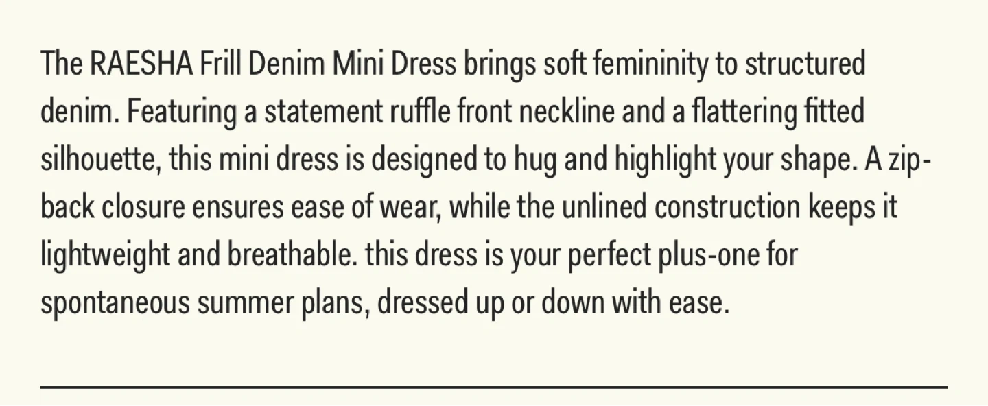 Size: XS. The RAESHA Frill Denim Mini Dress brings soft femininity to structured denim. Featuring a statement ruffle front neckline and a flattering fitted silhouette, this mini dress is designed to hug and highlight your shape. A zip-back closure ensures ease of wear, while the unlined construction keeps it lightweight and breathable. this dress is your perfect plus-one for spontaneous summer plans, dressed up or down with ease.