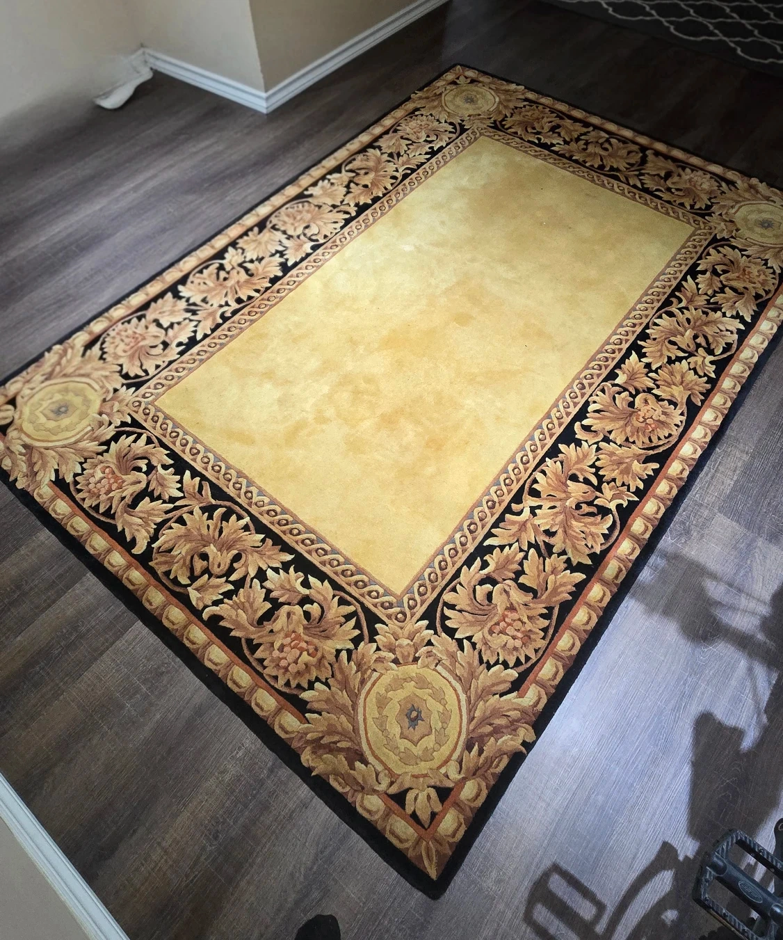 Selling a beautiful area rug with a unique floral border design. It's in great condition and would add a touch of elegance to any room! The rug features a central area in a light yellow tone, surrounded by an ornate floral pattern in shades of brown and black. Perfect for a living room or dining area!