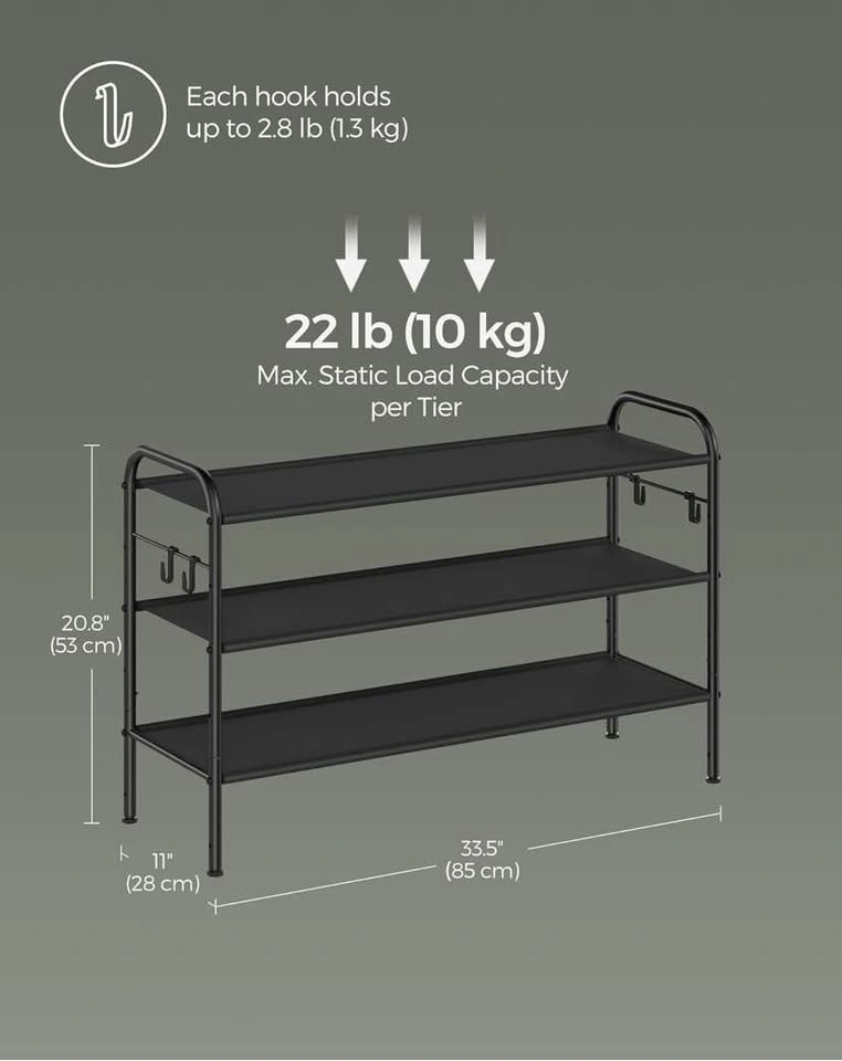 β’ 3 spacious tiers that hold up to 15 pairs of shoes
