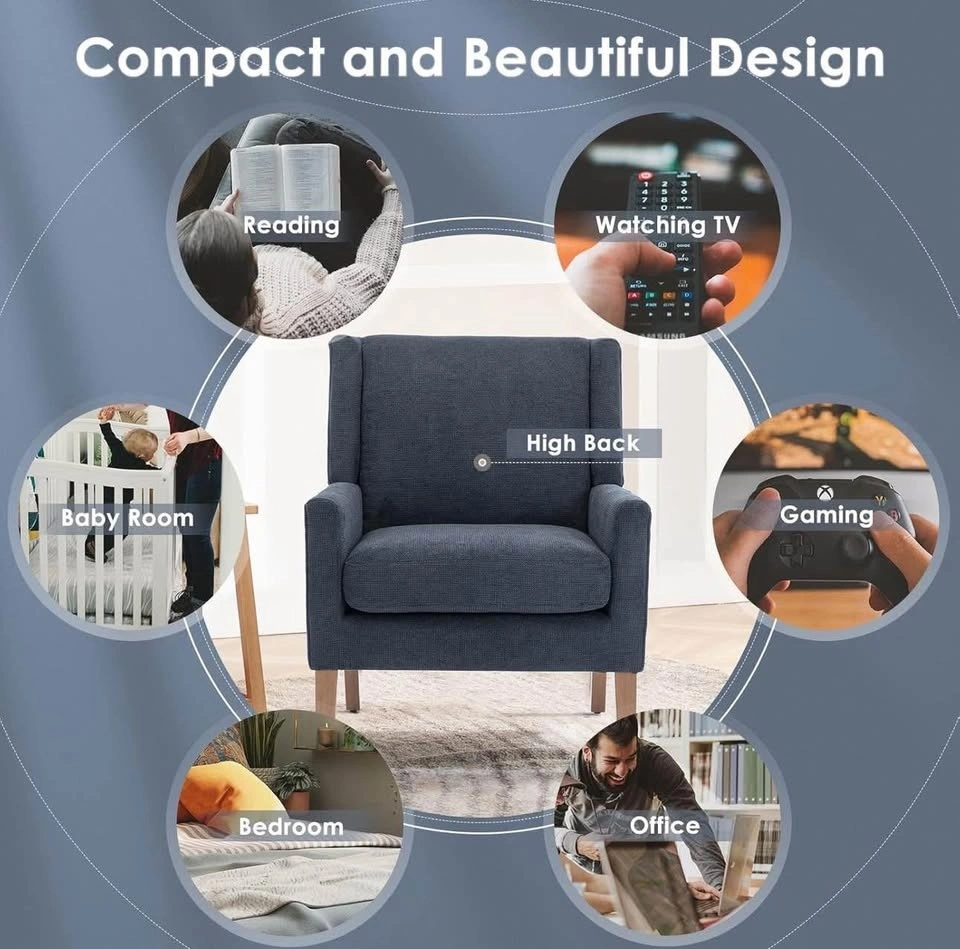 Add style and comfort to any room with this brand new COLAMY Modern Wingback Accent Chair. Upholstered in soft blue fabric and supported by sturdy wooden legs, it features a lounge-style seat for relaxing in the living room, bedroom, office, or reading nook. Modern design with classic wingback silhouette makes it both comfortable and decorative.