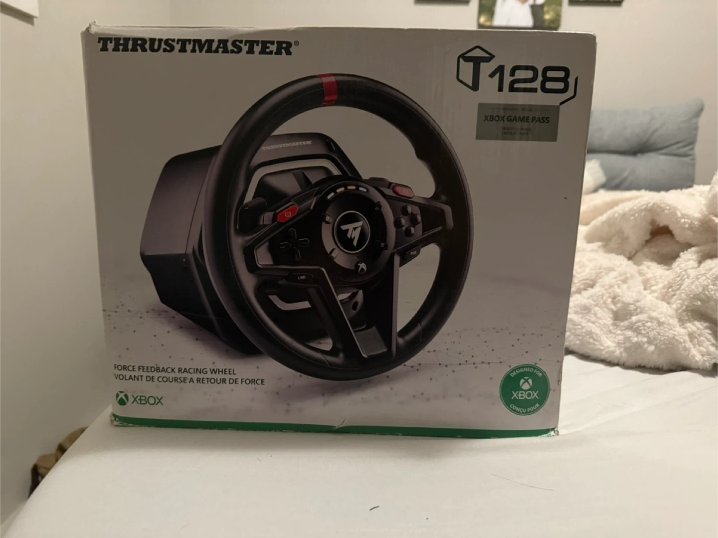 - Thrustermaster T128 force feedback steering wheel and pedals
