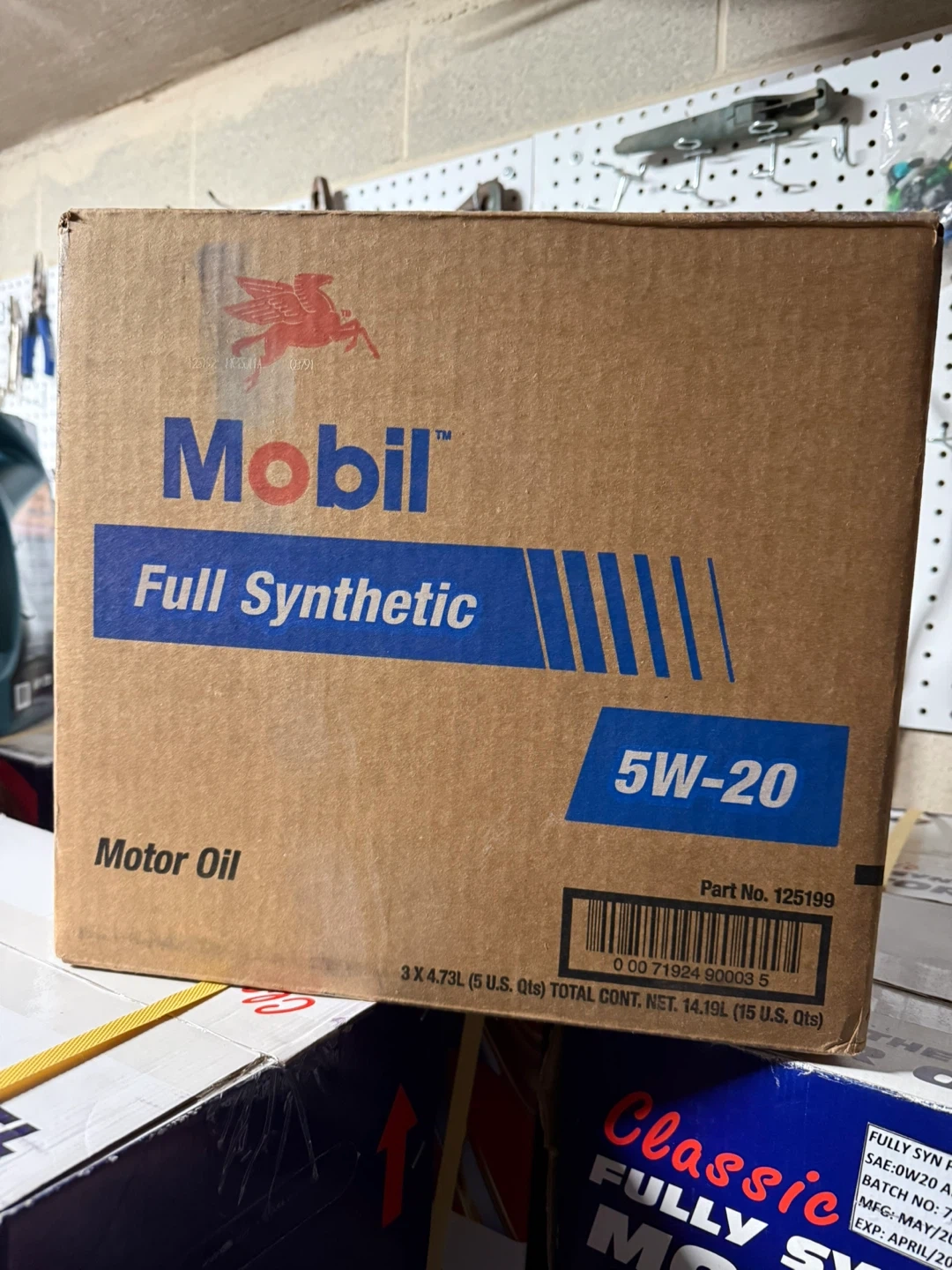 Selling a new, unopened box of Mobil Full Synthetic 5W-20 Motor Oil. Each box contains 3 x 4.73L (5 U.S. Qts), for a total of 14.19L (15 U.S. Qts).