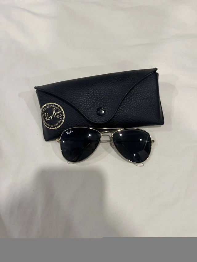 Selling a pair of classic Ray-Ban Aviator sunglasses. These stylish shades feature a gold frame and dark lenses, perfect for sunny days. This is a used item.