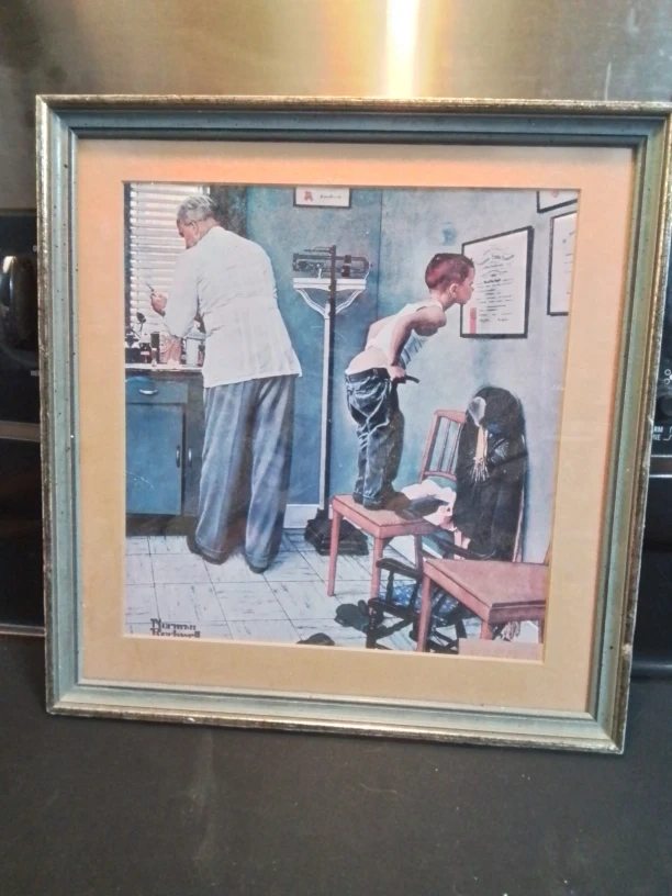 This framed Norman Rockwell print, titled 'The Injection', captures a humorous scene in a doctor's office, measuring 12.25x12.75 inches. The piece is in good condition, bringing a touch of classic Americana to any room. It's a delightful conversation starter and a must-have for collectors.