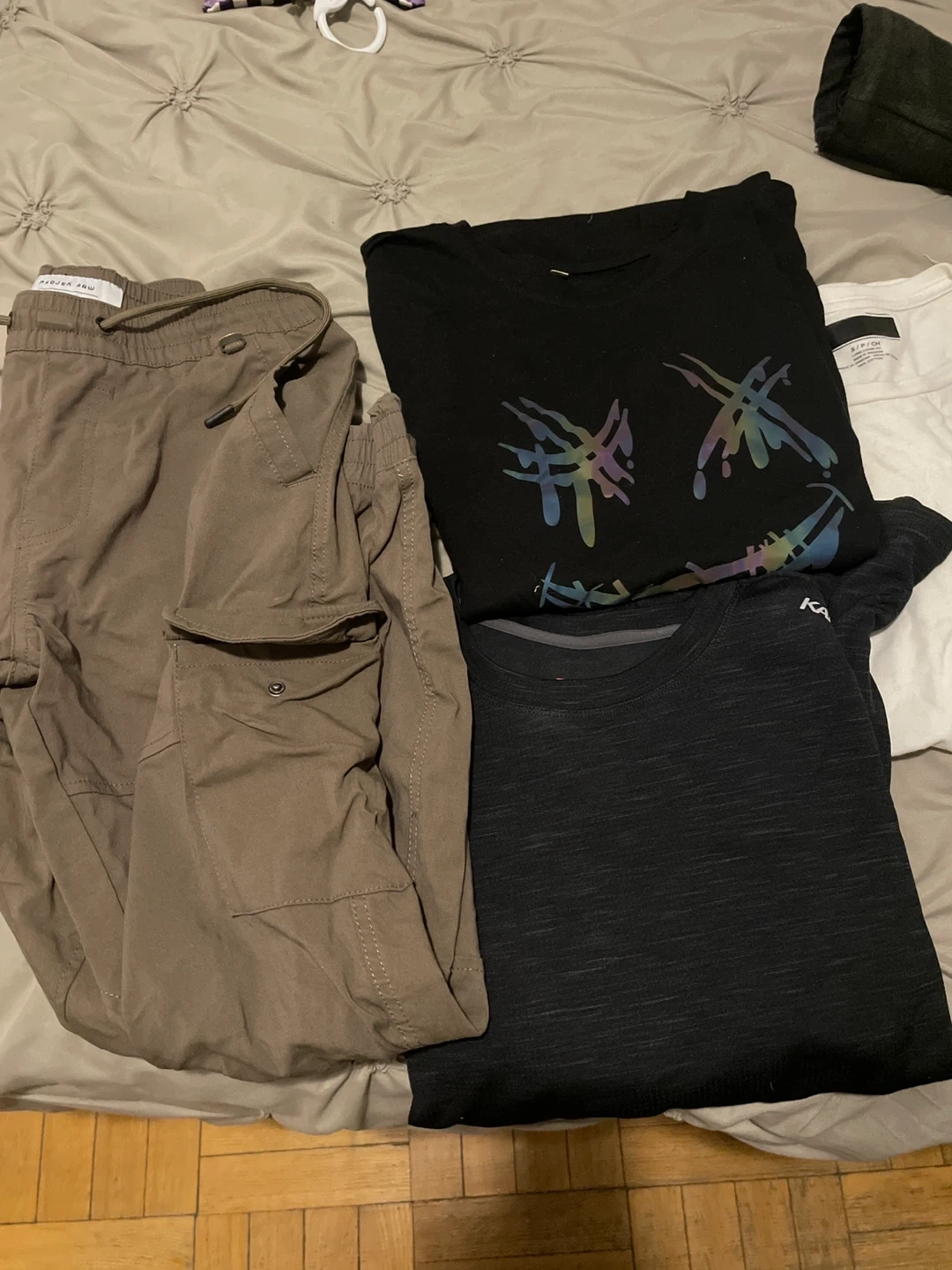 Selling a bundle of men's clothing. Includes jeans, shorts, shirts, and a coat. All in good condition and ready for a new wardrobe!