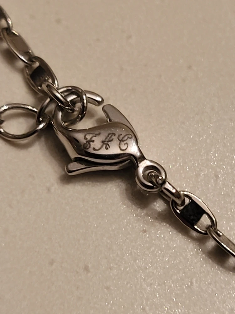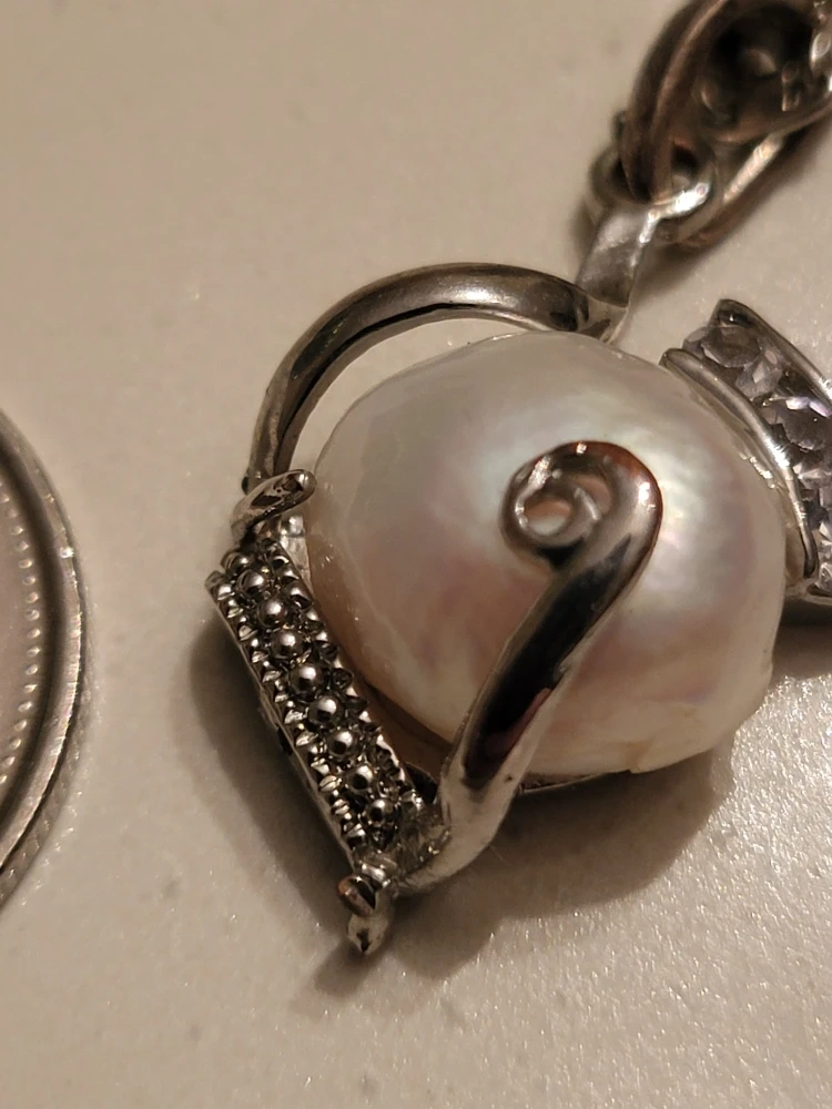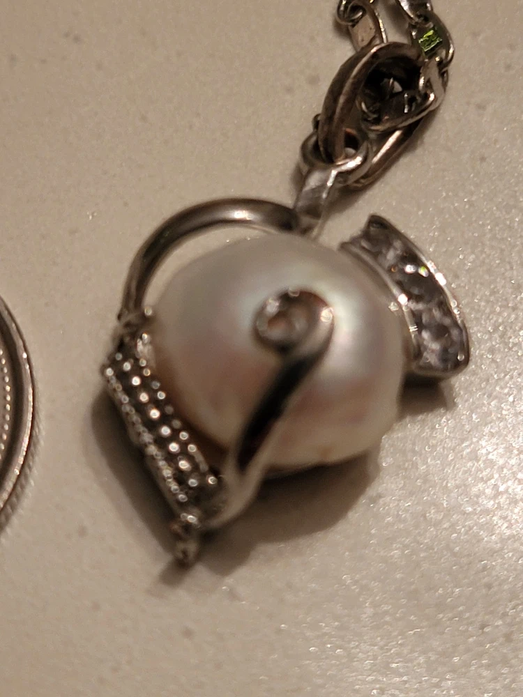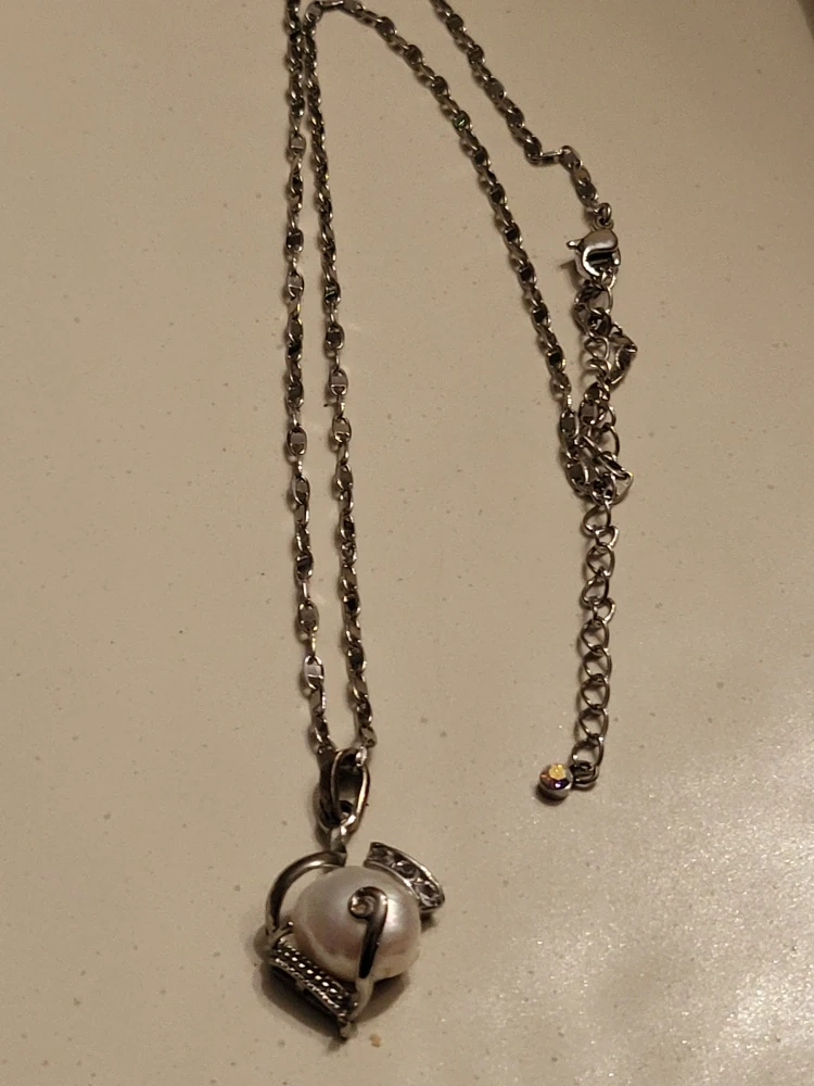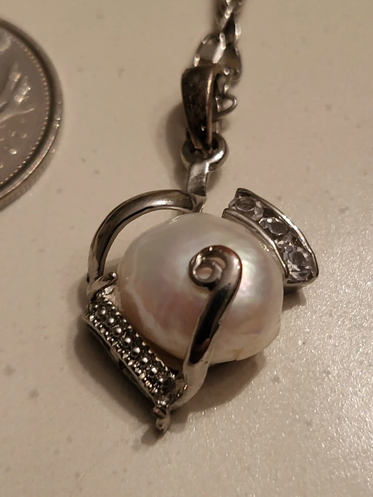 A lovely real pearl pendant necklace with a silver-tone chain. The pearl is a beautiful creamy white colour and is surrounded by decorative silver-tone metalwork. The chain has an adjustable length with a small decorative stone at the end.