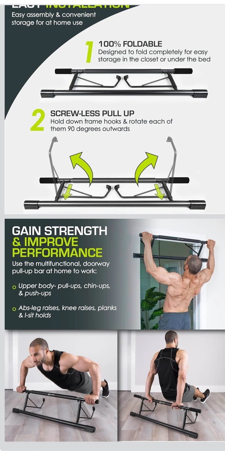 This ARTEESOL doorway pull-up bar is designed for easy assembly and convenient storage. It's 100% foldable, making it easy to store in the closet or under the bed. The bar is made of sturdy steel and can withstand up to 440 lbs. It works with wider door frames (27.5" - 36.2" wide; up to 8.25" thick).