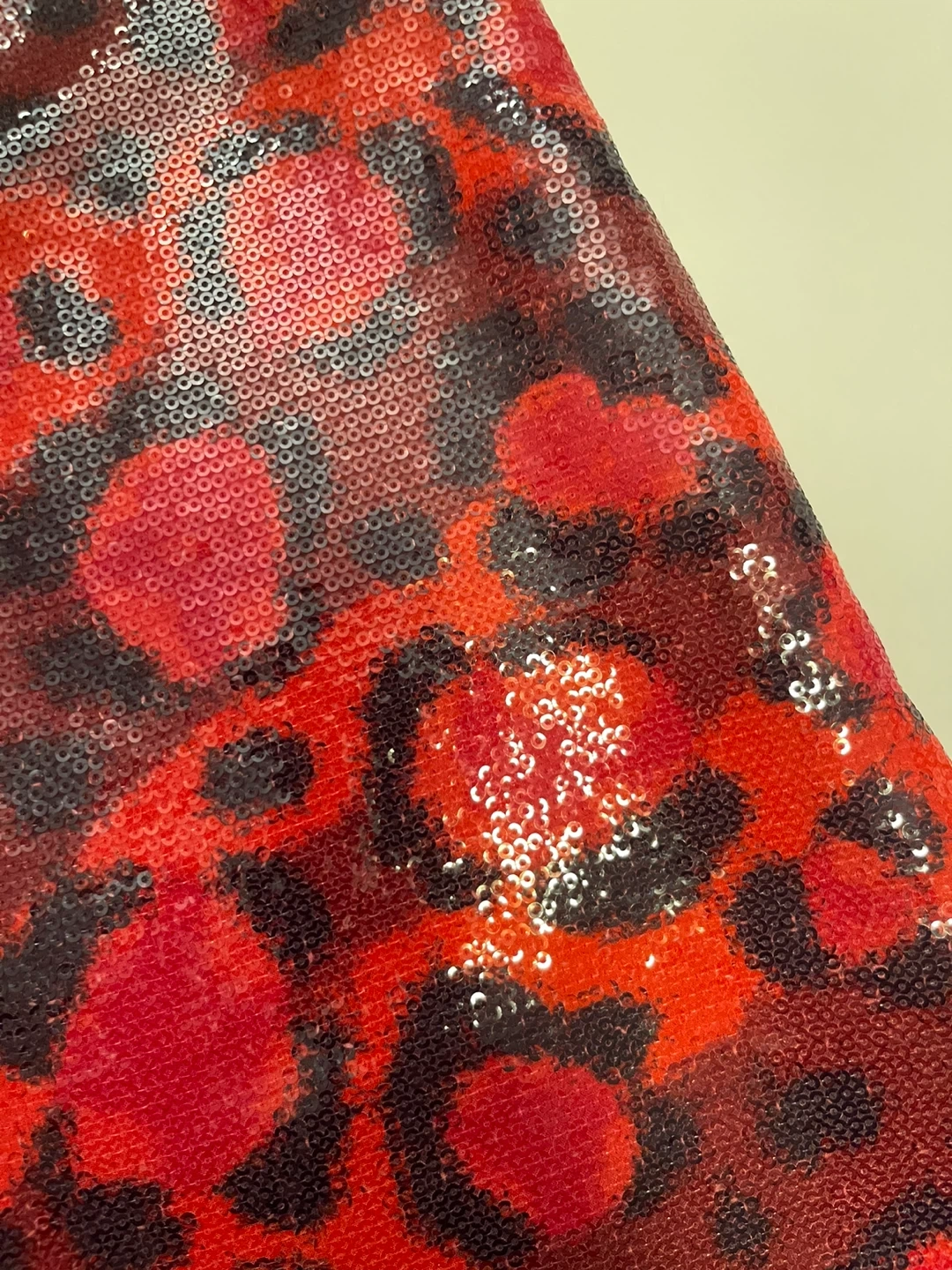 This is a Kenzo Kids dress with a vibrant red and black sequin pattern. The dress is labeled as size 14A. It's in great condition and ready for a new wardrobe!