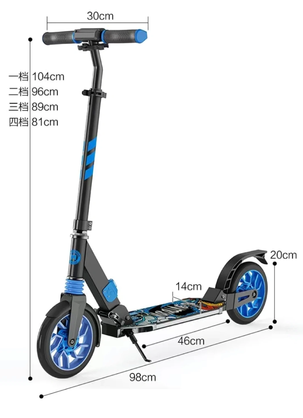 This is a Hot Wheels folding kick scooter in black and blue! It features an adjustable handlebar height. The scooter's dimensions are approximately 98cm in length and 30cm in handlebar width.