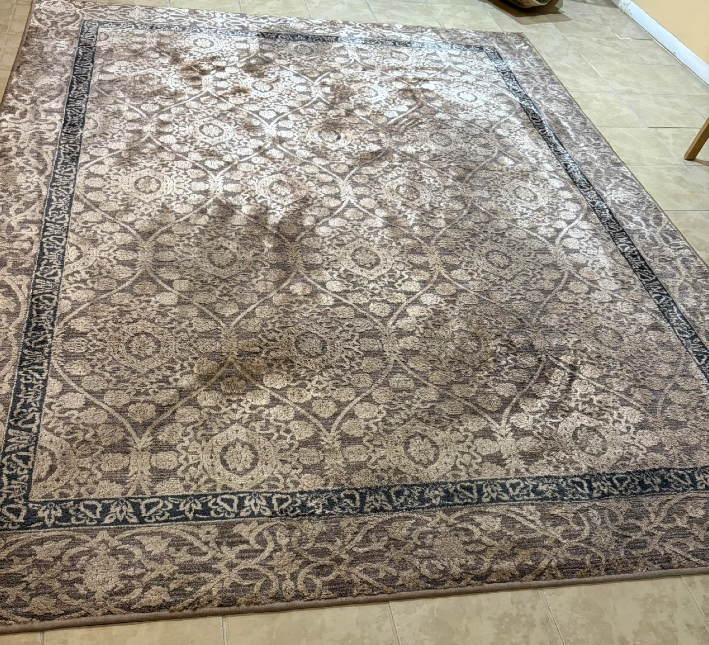 I am selling a patterned area rug. It has a brown and beige color scheme with a dark brown border. It would look great in any room!