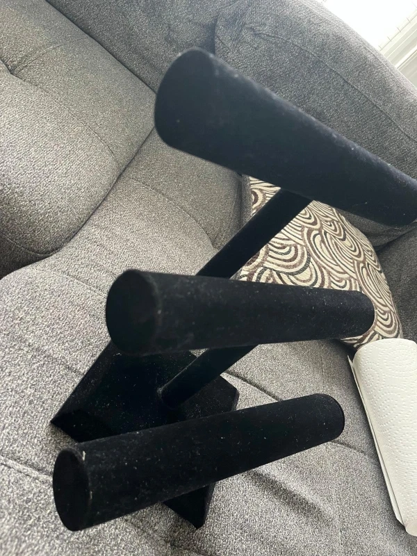 Here's a black velvet jewelry display stand! It's perfect for organizing and displaying your bracelets, necklaces, and other accessories. It's in great condition and ready for a new home!