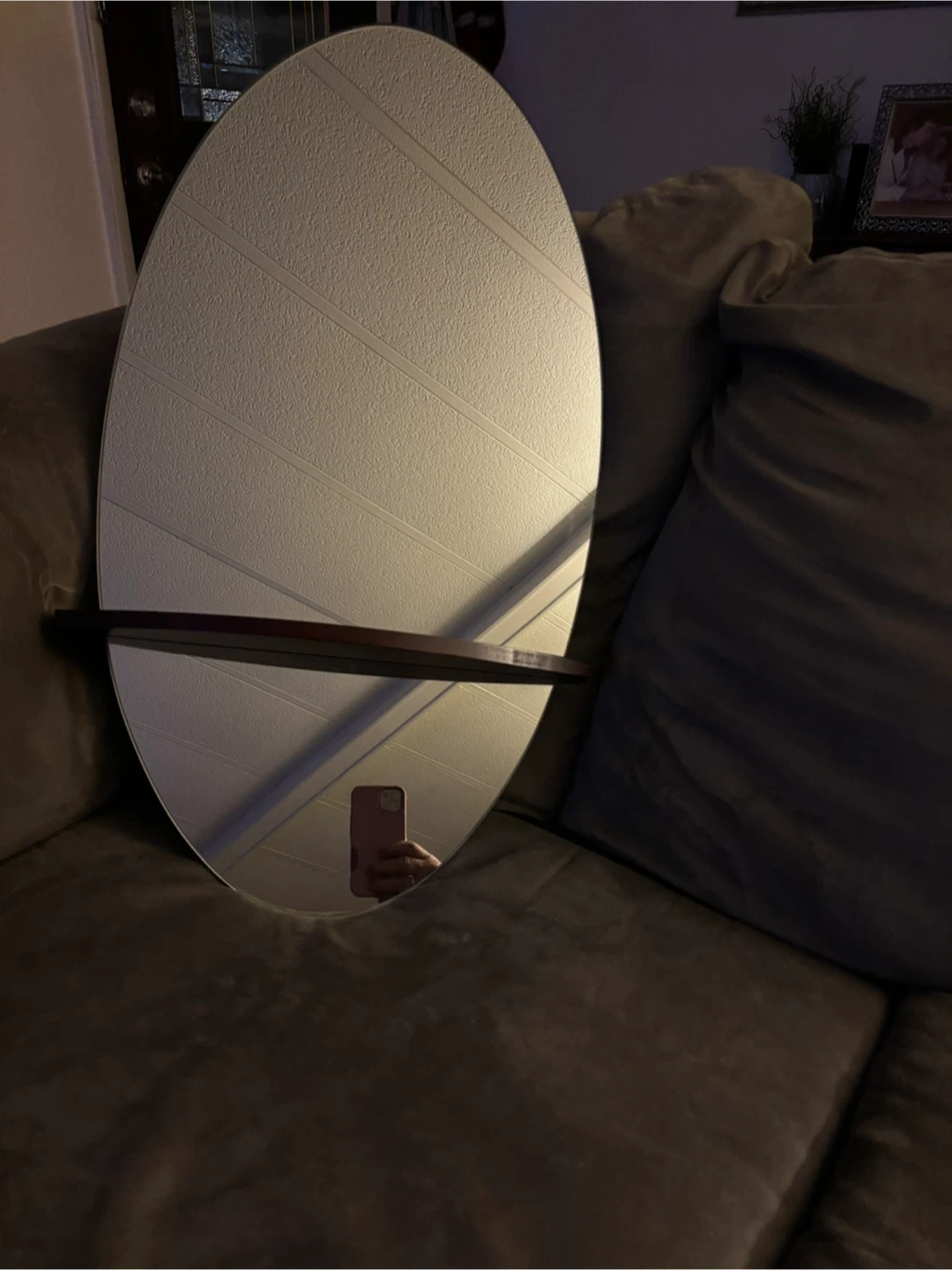 Selling an oval mirror with a shelf. It's in great condition and ready to add a touch of elegance to any room.