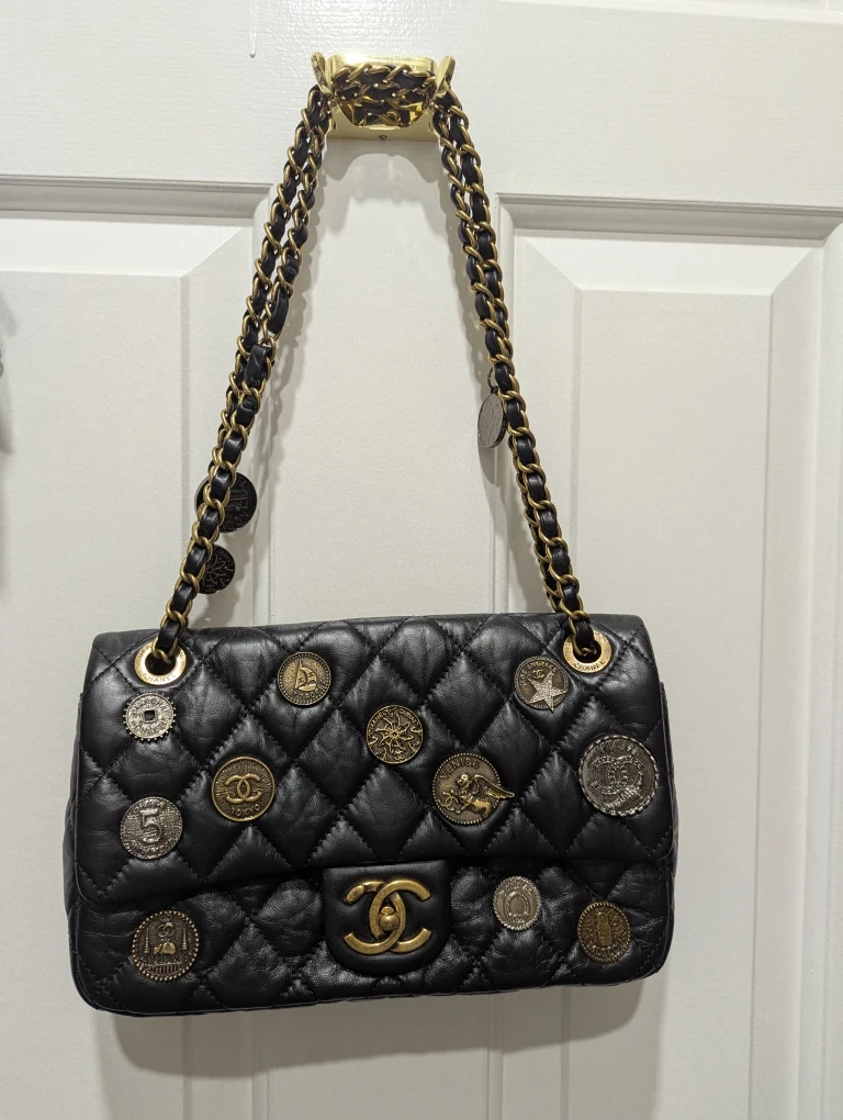 Selling a gently used Chanel flap bag! It features black quilted leather and unique coin embellishments. The chain strap is a mix of leather and gold-tone hardware. A stylish and eye-catching piece!
