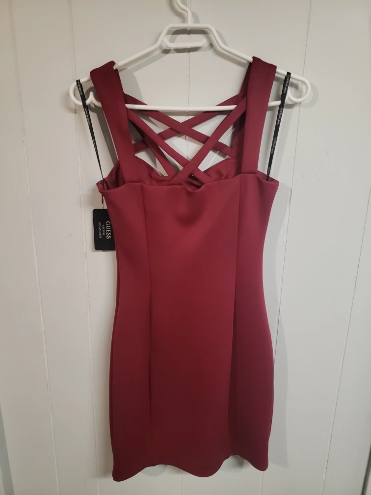This is a Guess mini dress in the colour Sangria. It is a size 2. It has a unique criss-cross back design and is brand new with tags! Originally bought for $128