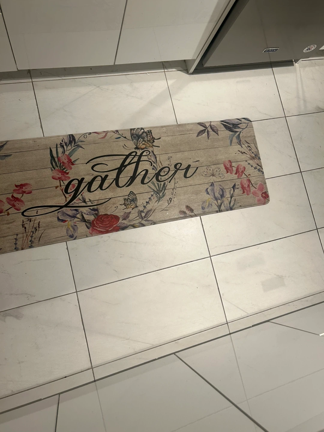Add a touch of charm to your kitchen with this floral 'Gather' kitchen mat! It features a lovely design with butterflies and flowers on a wood-look background. Perfect for adding a bit of warmth and style to your space