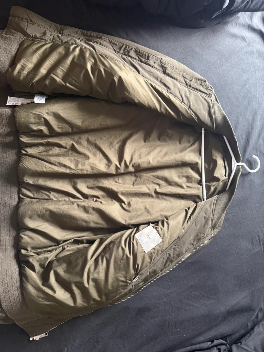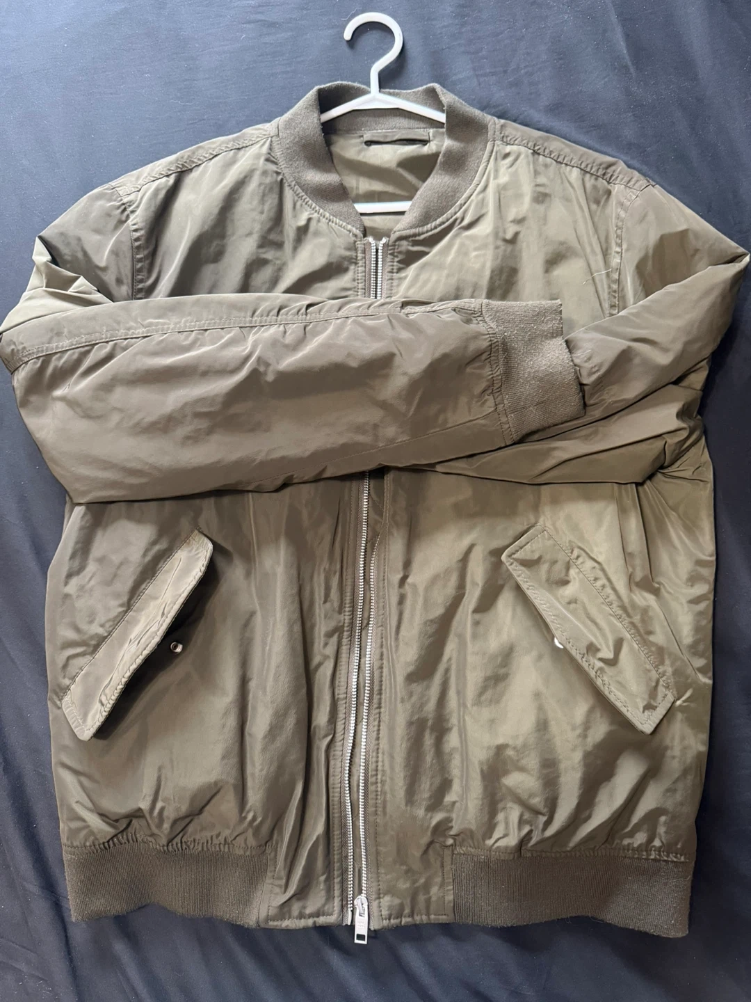 Selling a used bomber jacket that is in great condition. It is a dark olive colour in person and is size large. It is quite thick and has an inside pocket as well as two side pockets and a pocket on the arm sleeve.