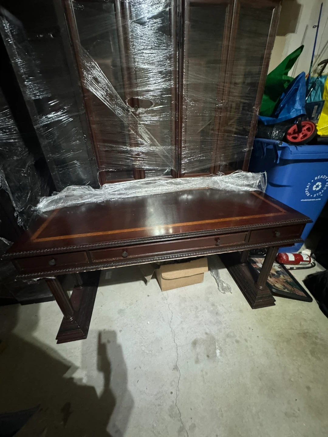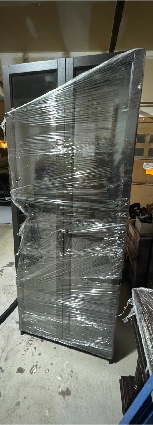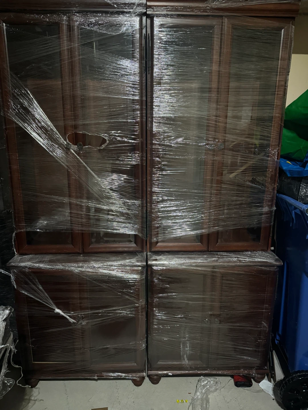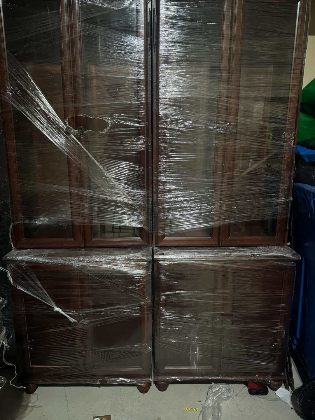 Selling a wooden office cabinets and desk set. It is a dark brown colour. The hutch has glass doors on the top portion. All items are wrapped in plastic.