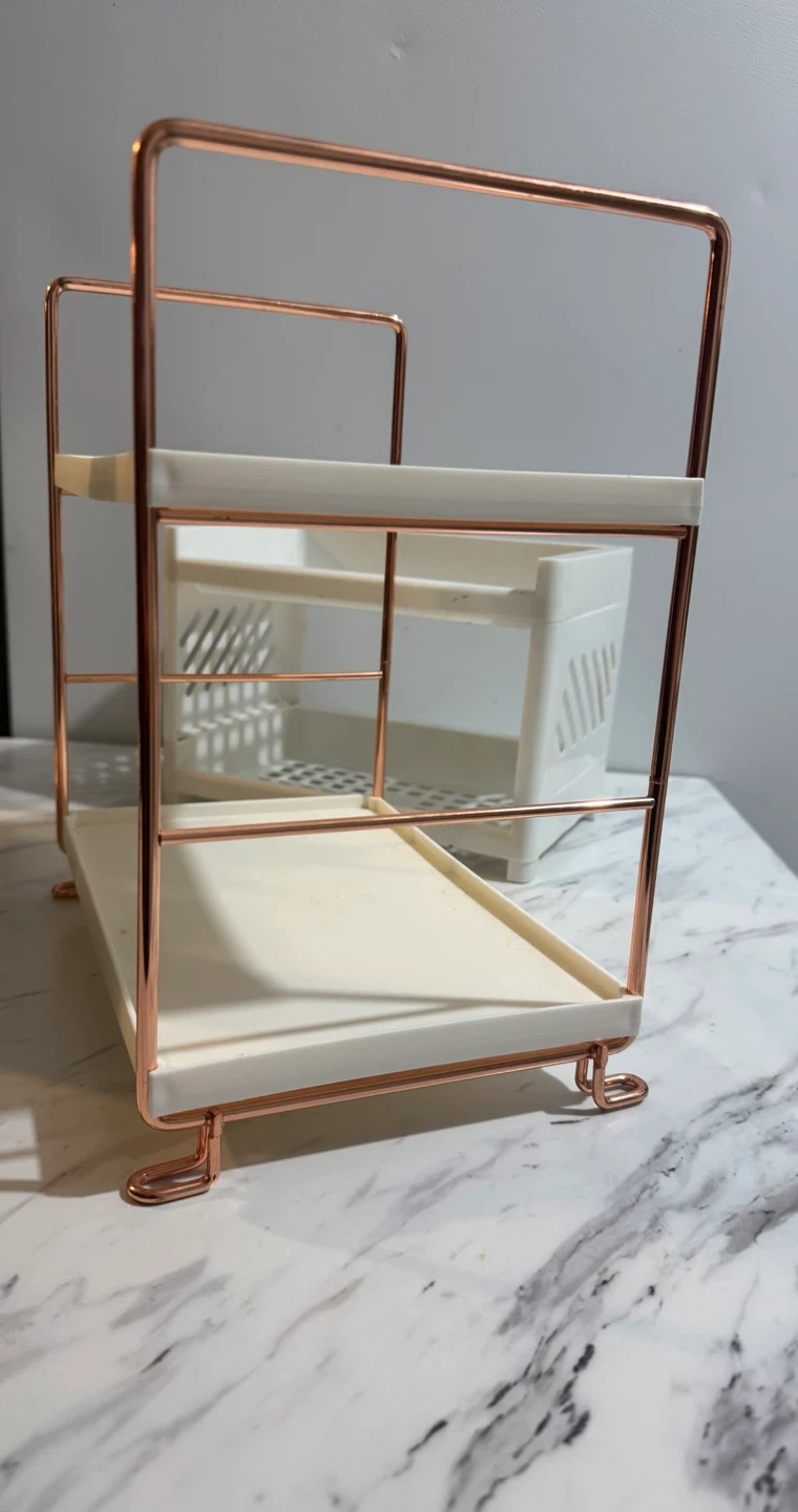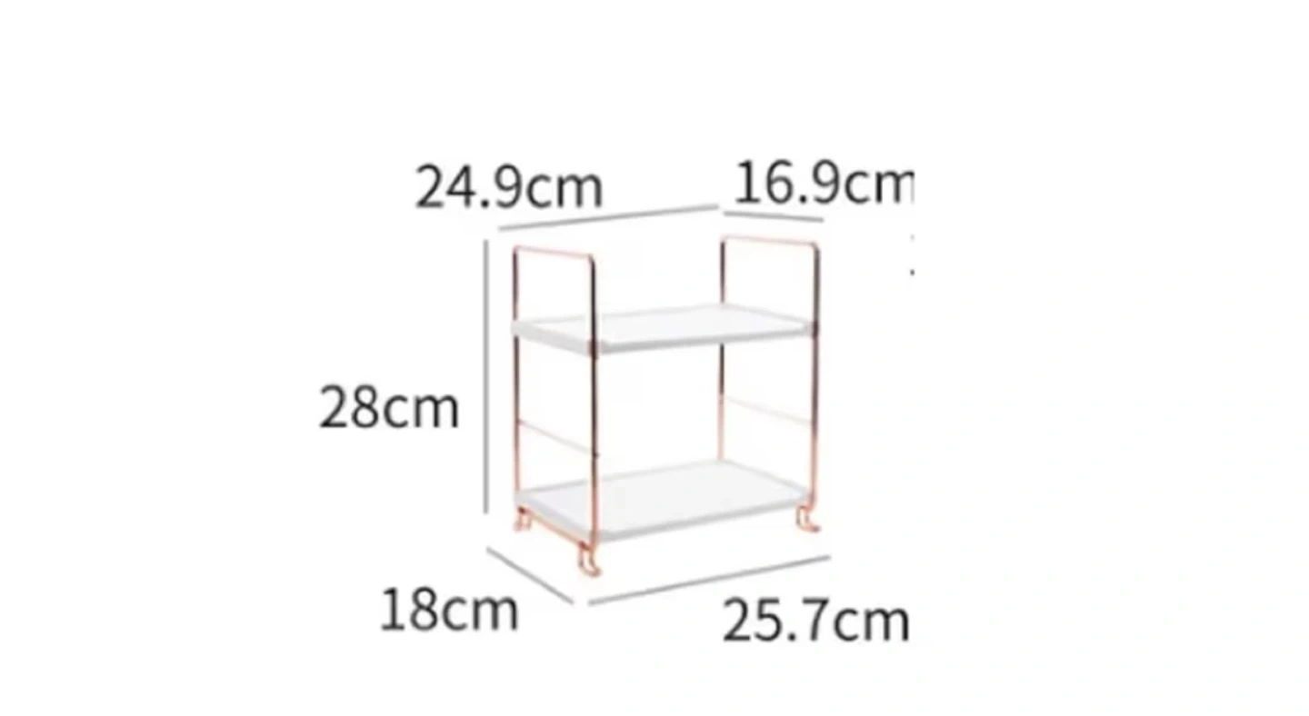 Declutter your bathroom counter with this handy 2-tier organizer! It features a stylish rose gold frame with white shelves, perfect for storing toiletries, makeup, or towels. The dimensions are approximately 24.9cm x 16.9cm x 28cm.