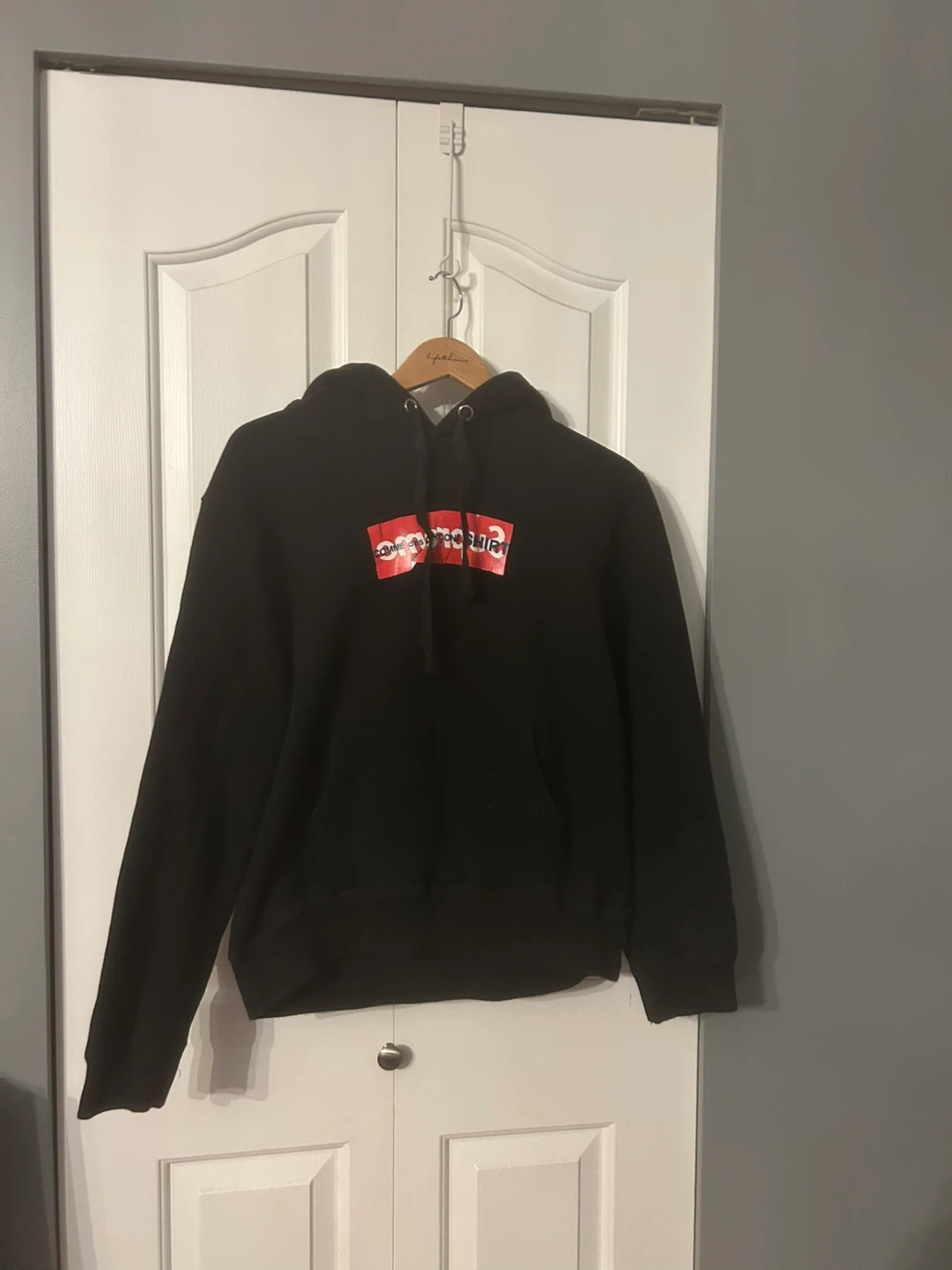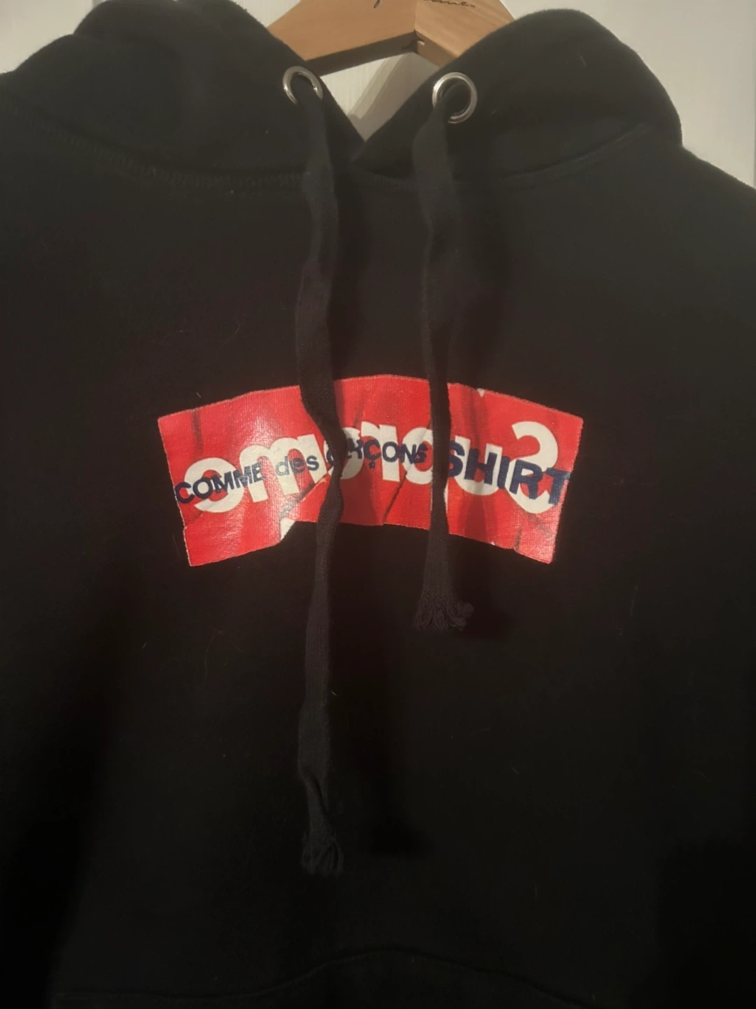 Supreme Comme des Garçons box logo hooded sweatshirt. Color: Black. Size: large Heavyweight cotton crossgrain fleece with pouch pocket. Box logo printed on chest