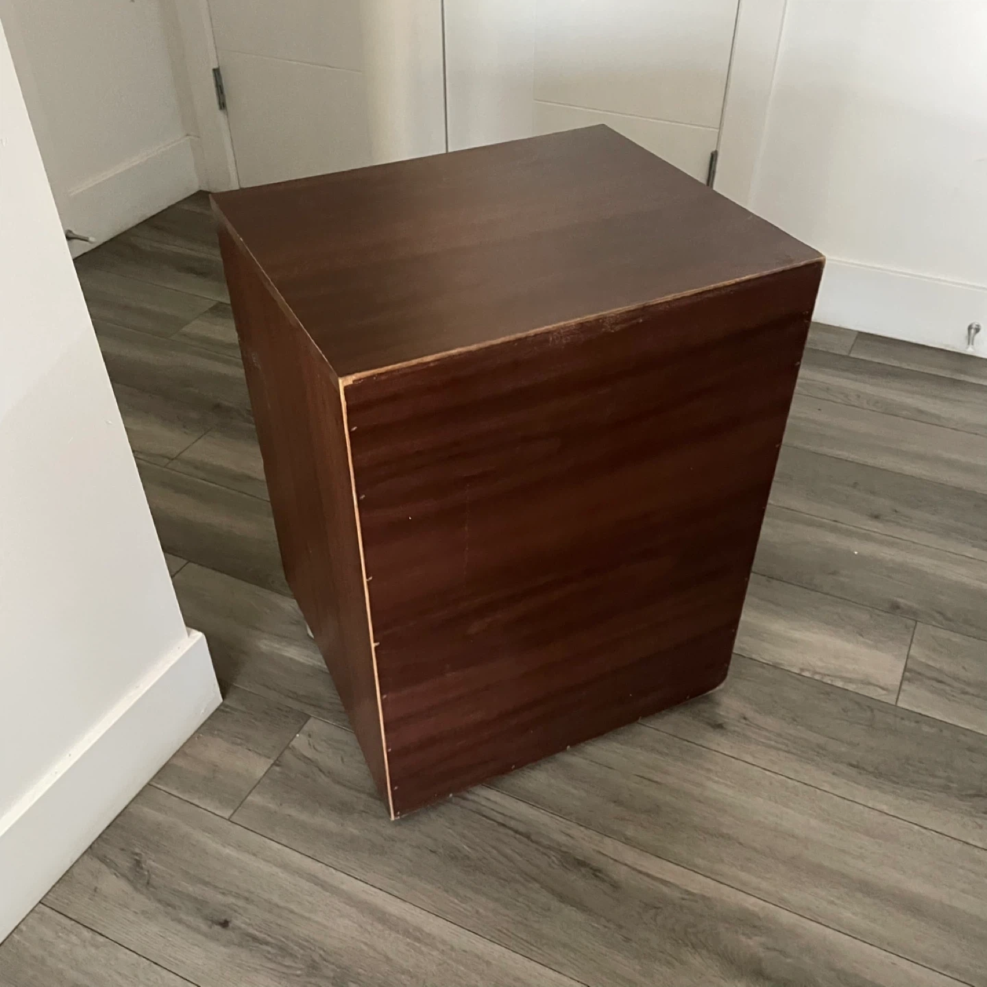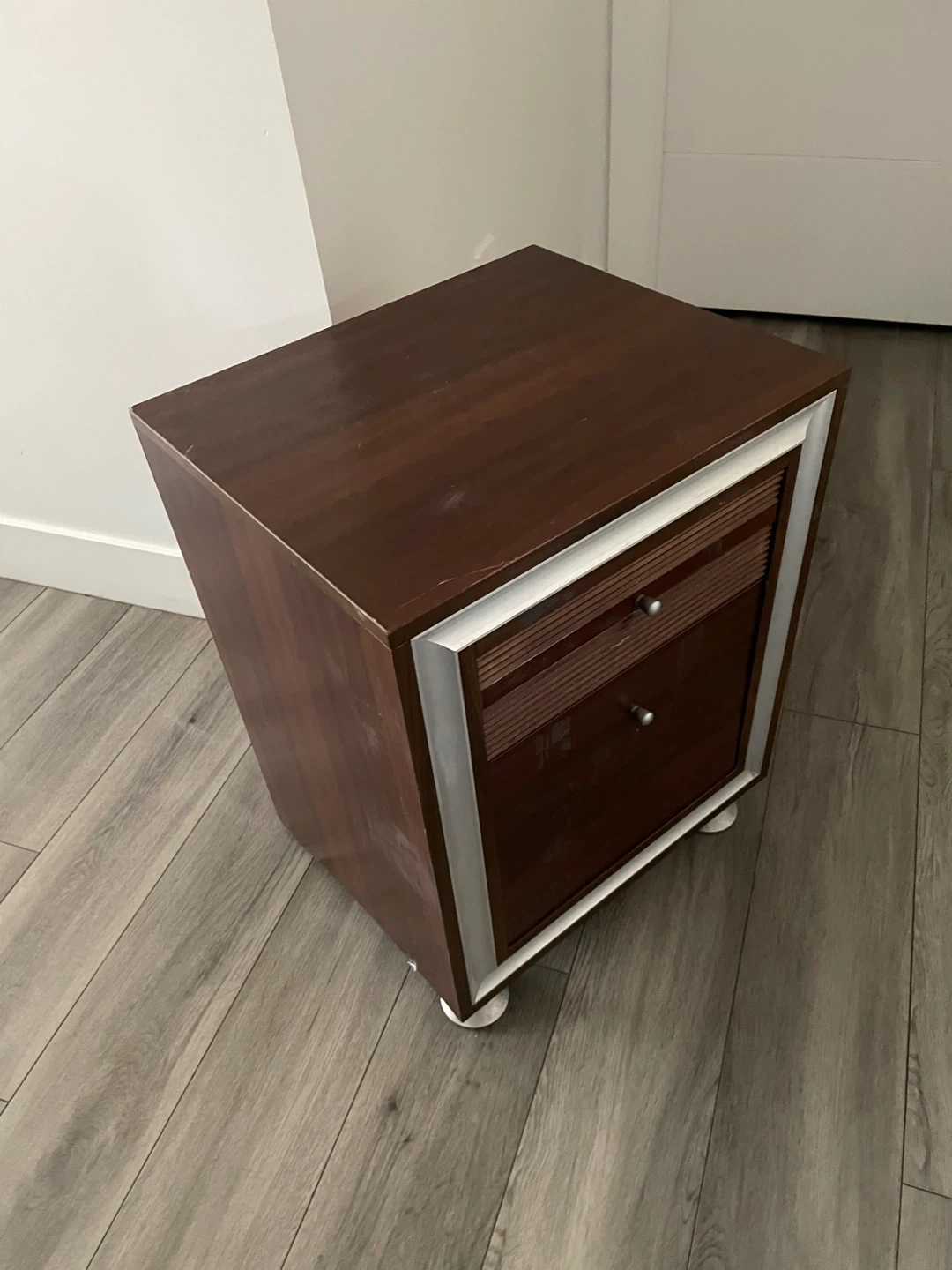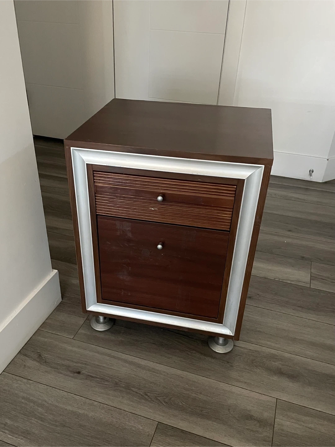 Brown Wood Nightstand with Drawers With A White Trim. It Has Two Drawers, Perfect For Storage. It's In Good Condition Has Some Wear.
