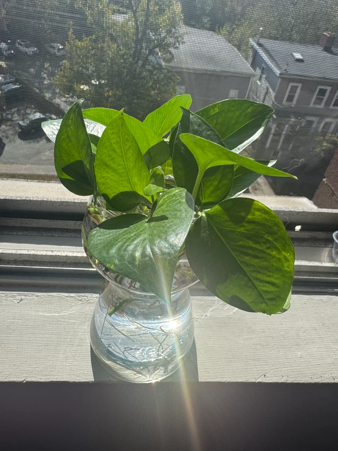 I'm selling a healthy pothos plant rooted in a clear glass vase. It's a beautiful and easy-to-care-for houseplant that will add a touch of green to any room!